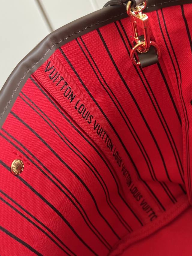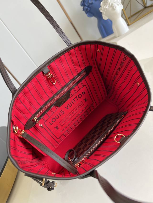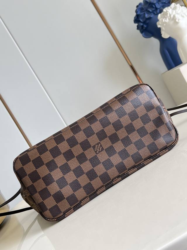 This Neverfull small tote bag is crafted from Damier Ebene canvas for a spacious build, complemented by cowhide leather trim and a bright fabric lining, blending classic design with vintage elements. Side straps allow for both modern and casual styles, while a detachable zippered pocket can be used as a clutch or pocket. The slim handles allow for comfortable shoulder or elbow carrying.