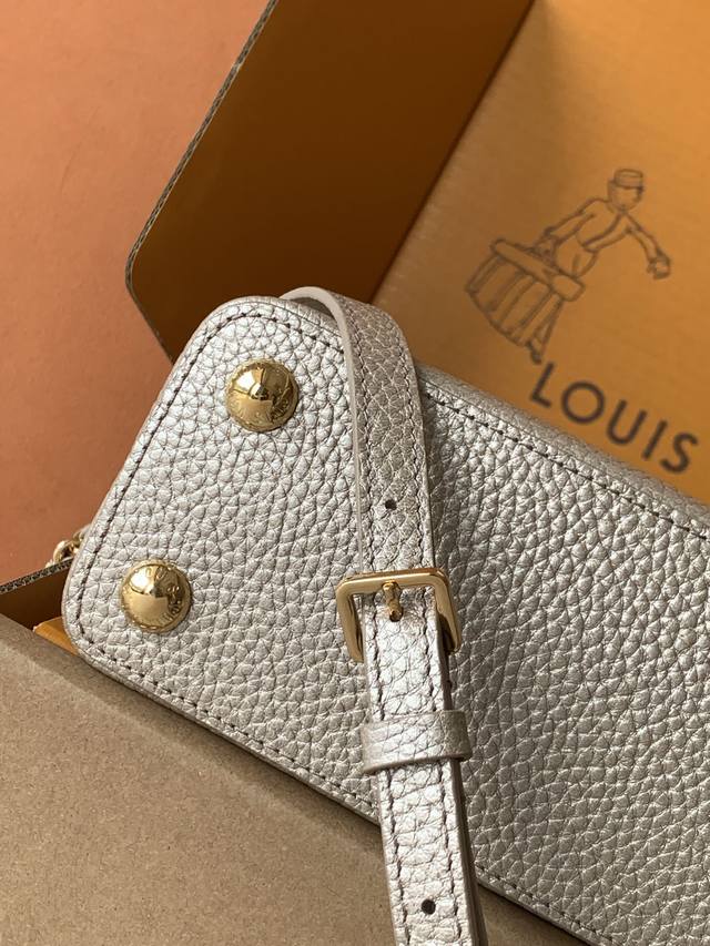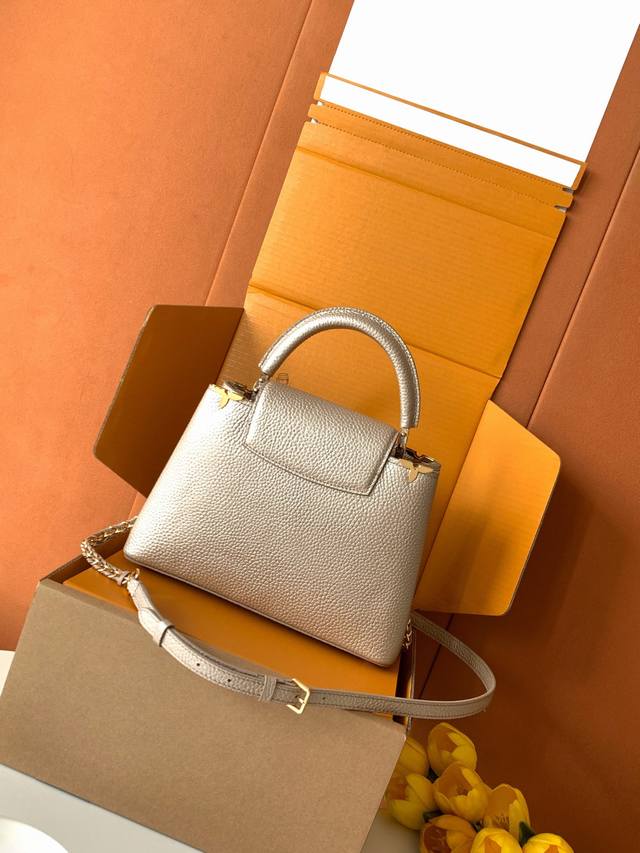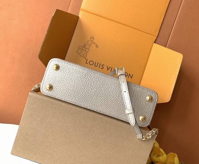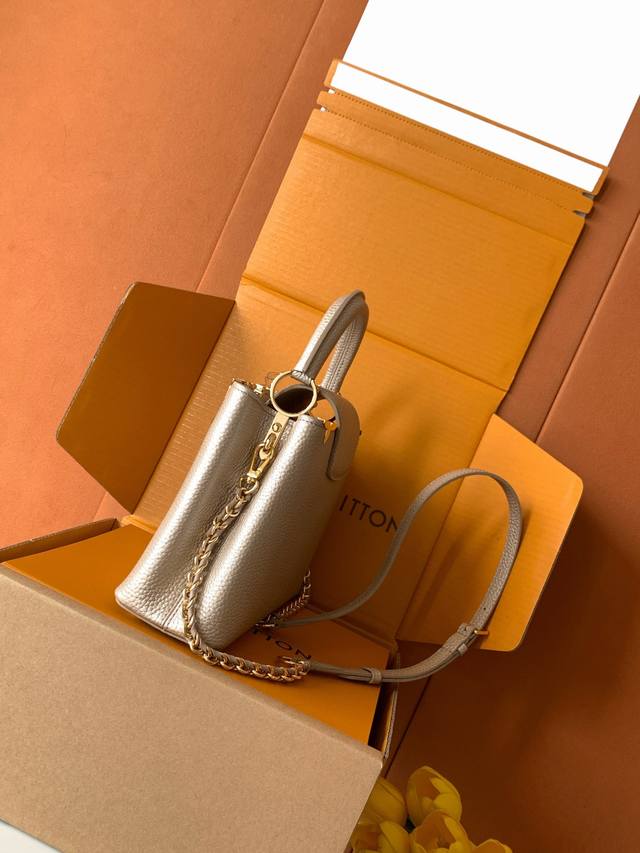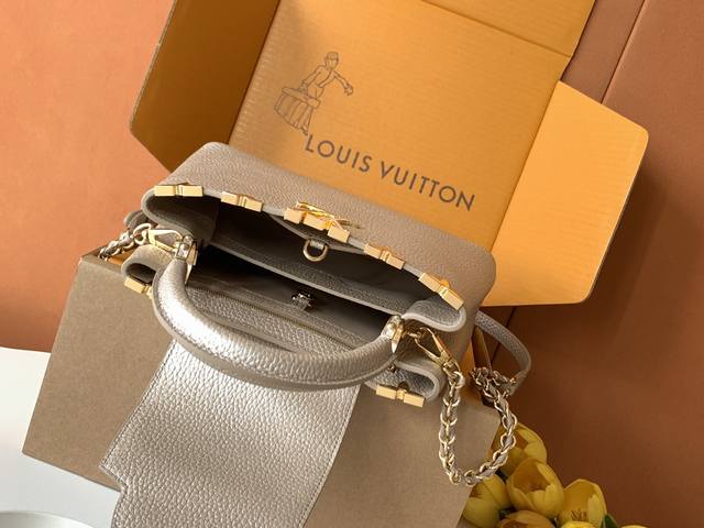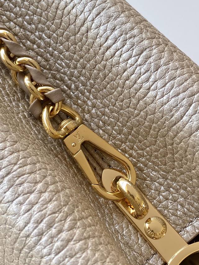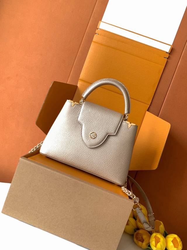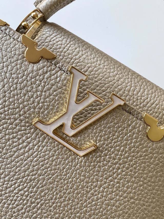 This Capucines BB handbag is made of metal-crafted Taurillon leather, topped with a gold Monogram floral "crown," and hand-finished. Its adorable mini size and delicate floral embellishments are charming, while the stylish detachable wide strap and top leather handle offer multiple carrying options.