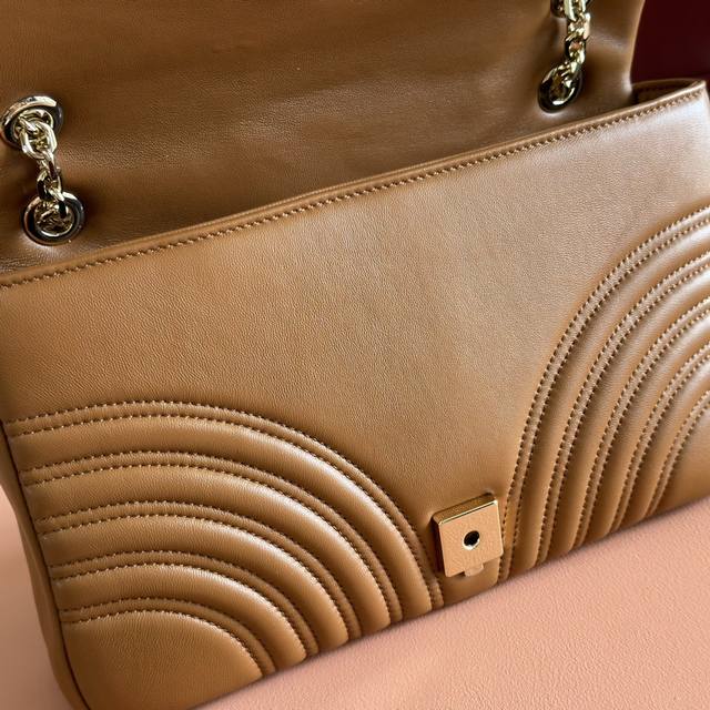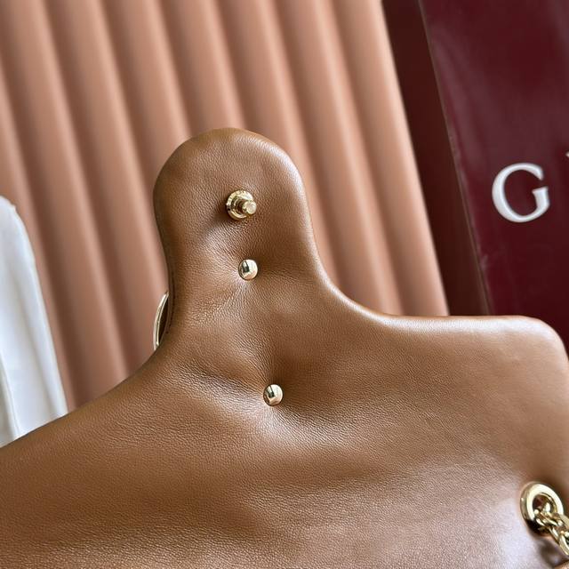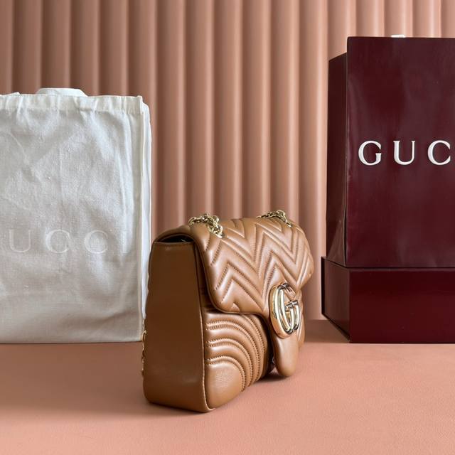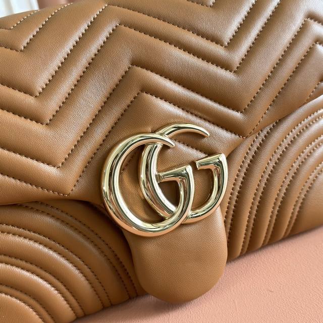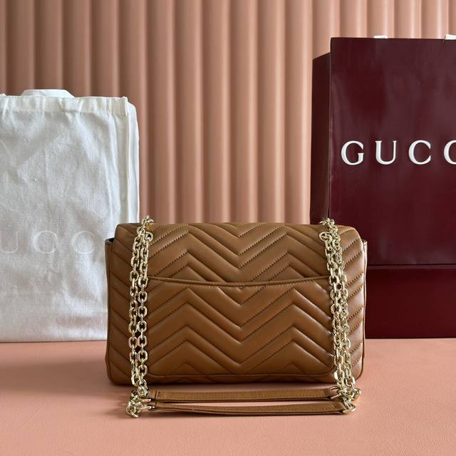 Features the brand's iconic GG Marmont series, crafted with double-G hardware and a faceted chain strap. The bag's soft leather creates a graceful silhouette. A clean, minimalist back pocket enhances the practicality of the medium and large sizes. Black V-shaped Matelass