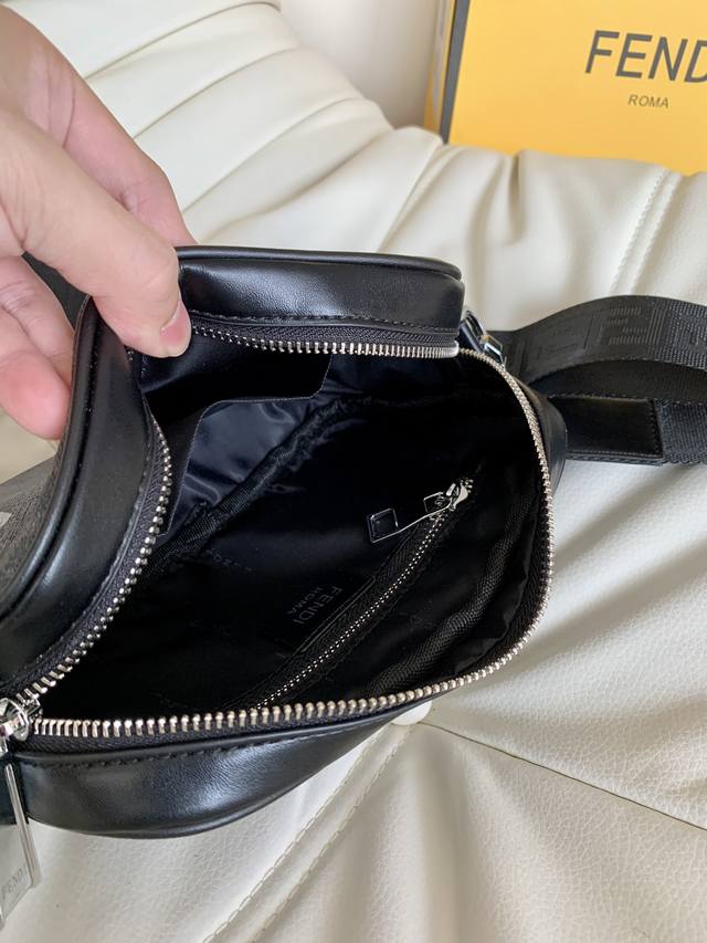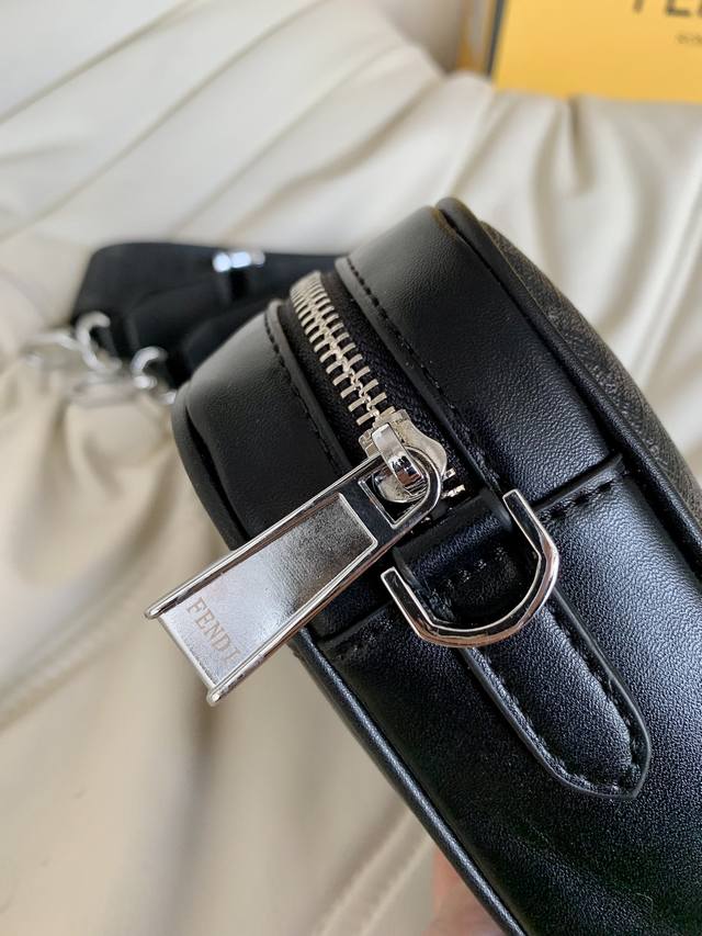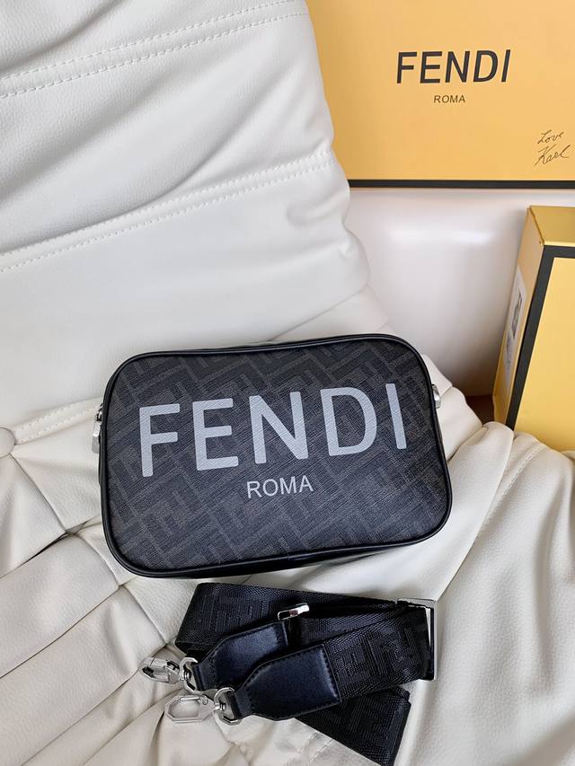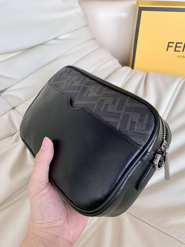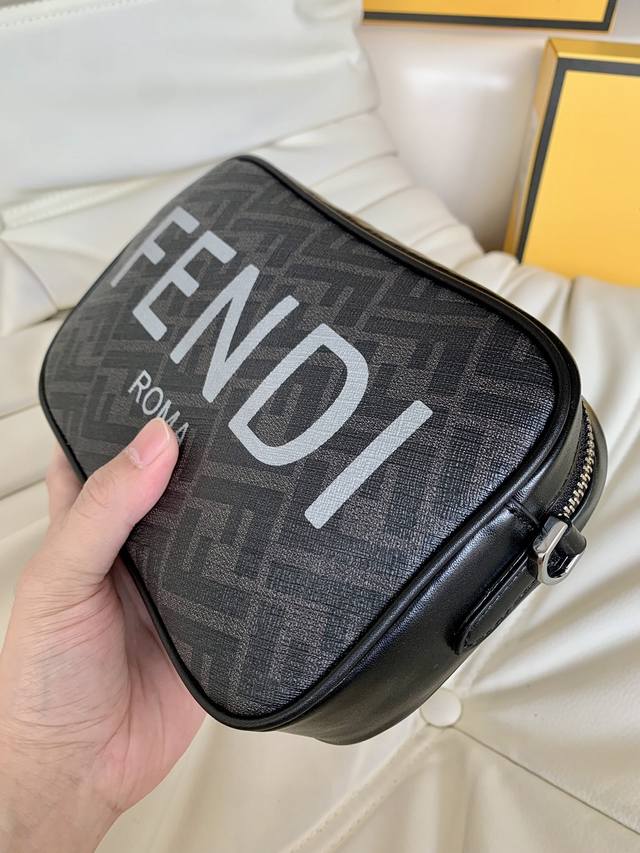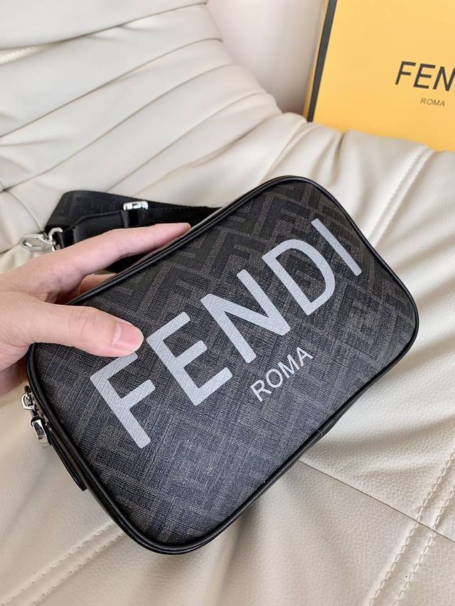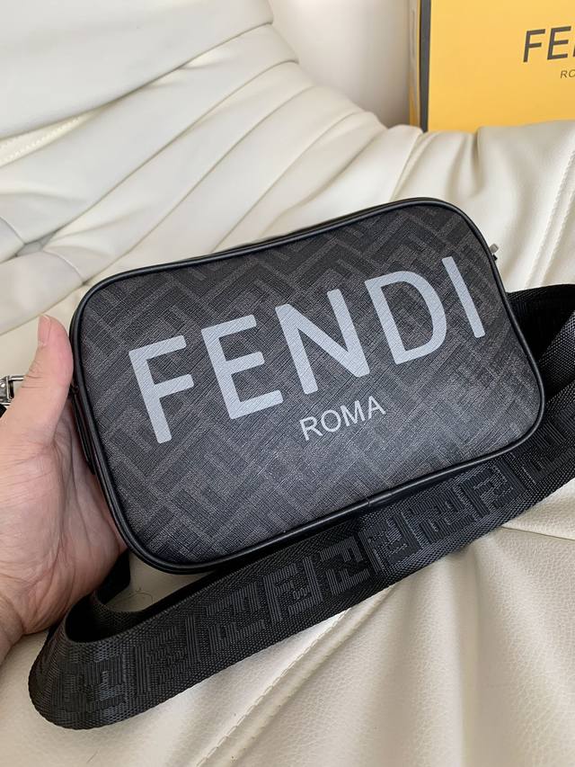 Fendi Pouch men's camera bag is here! The perfect combination of cowhide leather and printed PVC twill with the double F logo is sure to turn heads. It can hold all your small items. The unique double F print is a recurring element in Fendi's recent designs. Fen.Di men's crossbody bag, size: 22145