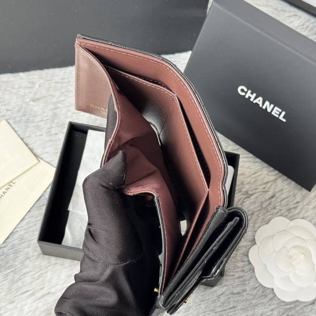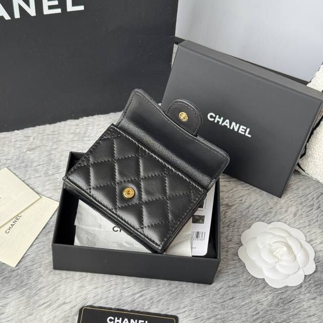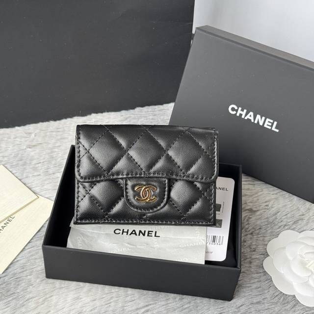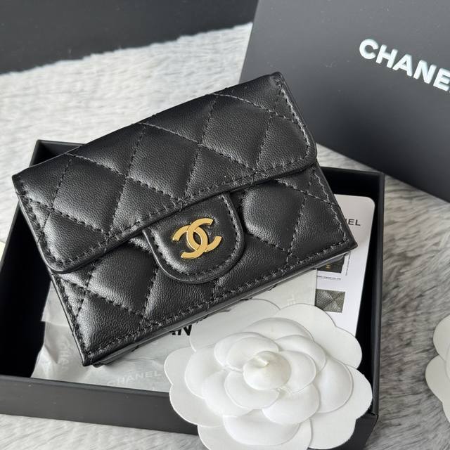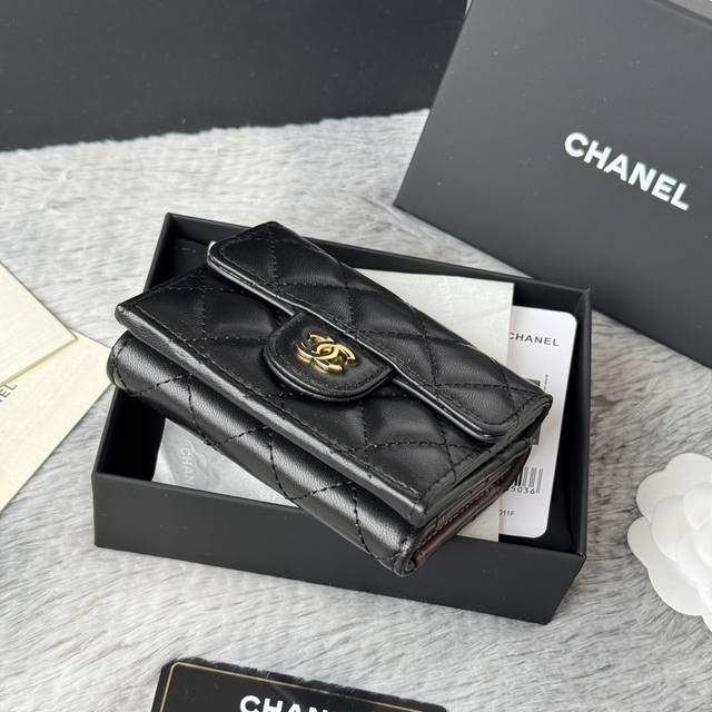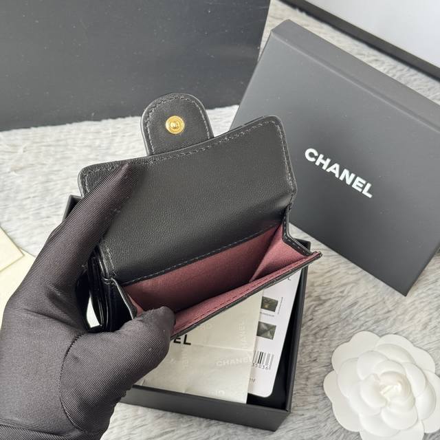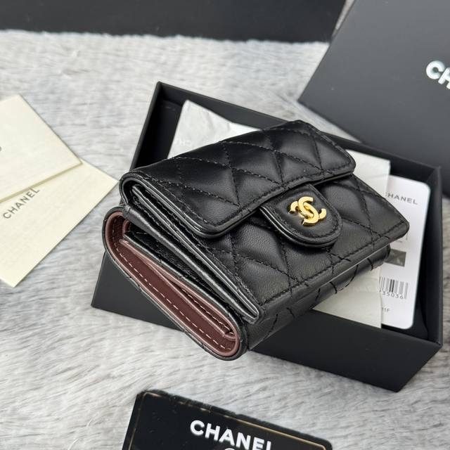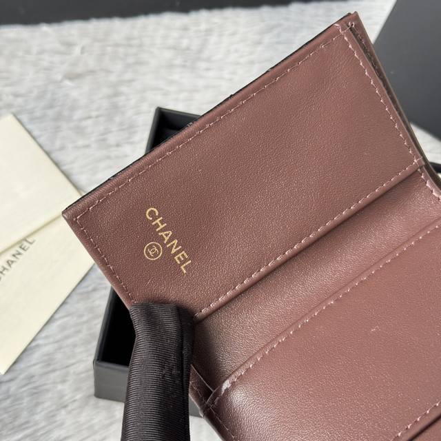 First release of a tri-fold wallet. A new tri-fold wallet in lambskin, also a card holder. At first glance, it looks like a card holder, but when you open it, you realize the front is a card holder for coins and bank cards, while the back is a wallet