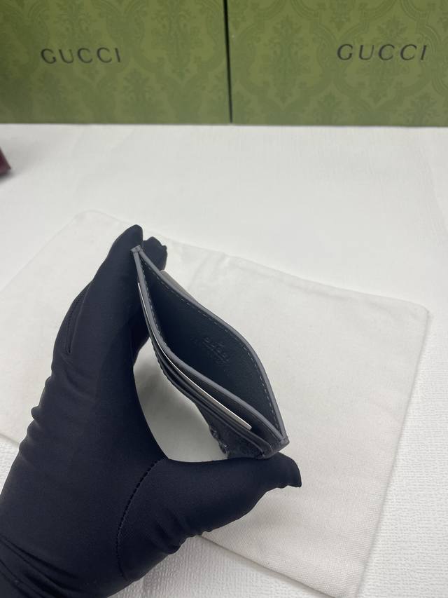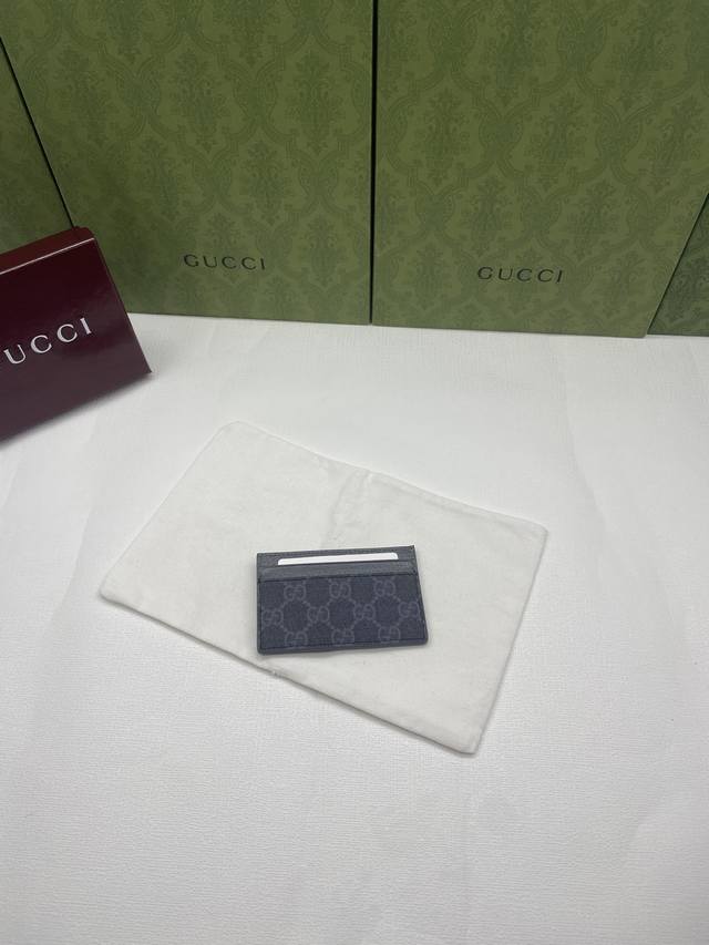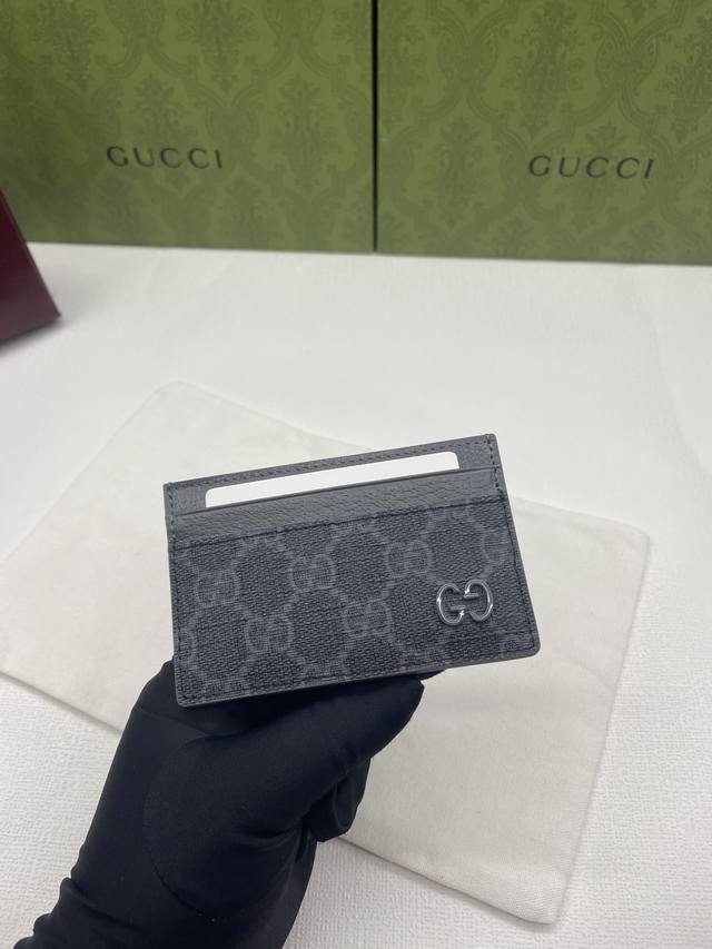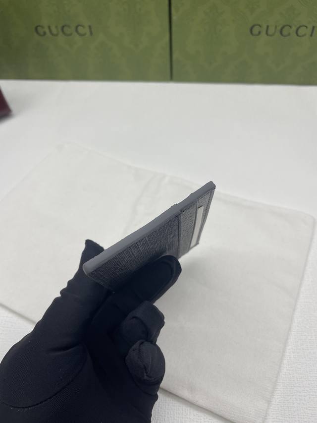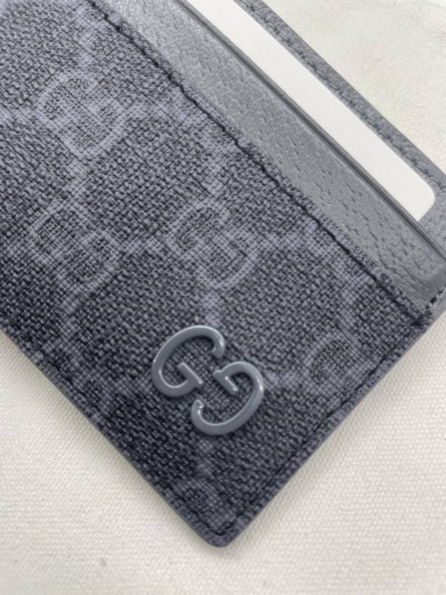 Gg detail card holder. This card holder is crafted from beige and ebony Gg Supreme canvas, showcasing the brand's heritage details with elegant sophistication. Small red Gg hardware details add a touch of brightness to the overall design. This piece features four card compartments, enhancing its overall appeal. Beige and ebony Gg Supreme canvas, yellow leather trim, brass hardware, red ceramic effect finish, cloud-patterned fabric lining, Gg details, 4 card compartments. Model: 768248. Dimensions: 11cm wide x 7cm high. Color: Grey PVC leather.