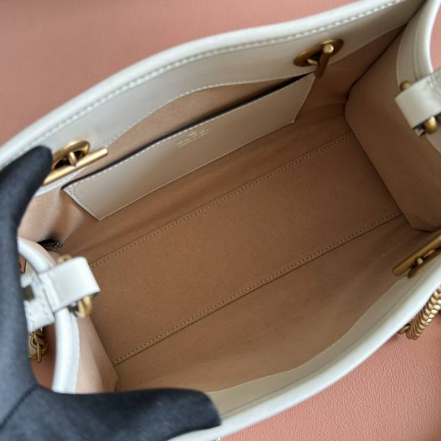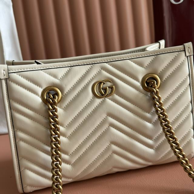 Gg Marmont Small Tote Bag with Boutique Packaging Style No. 779727 Aadk4 1000 The Gg Marmont series continues to shine in the Spring/Summer 2017 collection. This small tote bag is crafted from black quilted leather, featuring the timeless double G logo and gold-tone hardware, a charming interpretation of the brand's classic style. Black quilted V-shaped leather Antique gold-tone hardware Suede microfiber lining Double G logo Open interior pocket Adjustable leather handle Shoulder strap 26cm high Weight: approx. 0.65kg Small size: 26.5cm x 18.5cm x 12.5cm Made in Italy Model height: 176cm Maximum capacity: iPhone Pro Max Plus, AirPods, small wallet and lipstick
