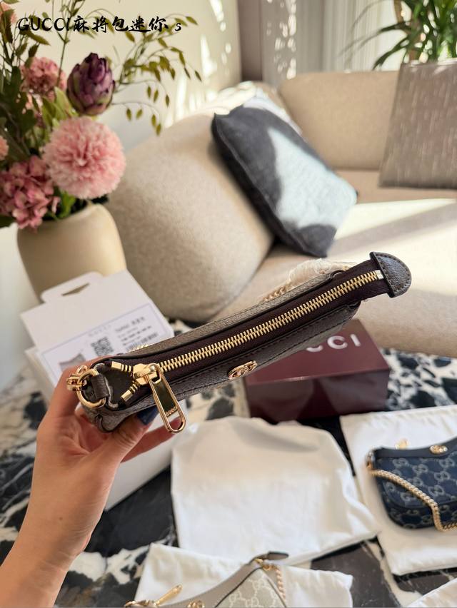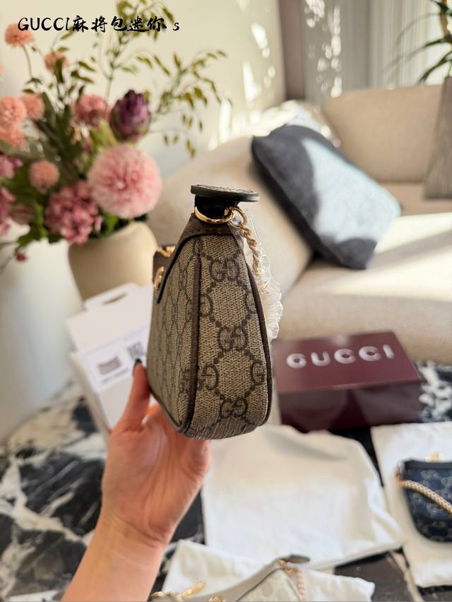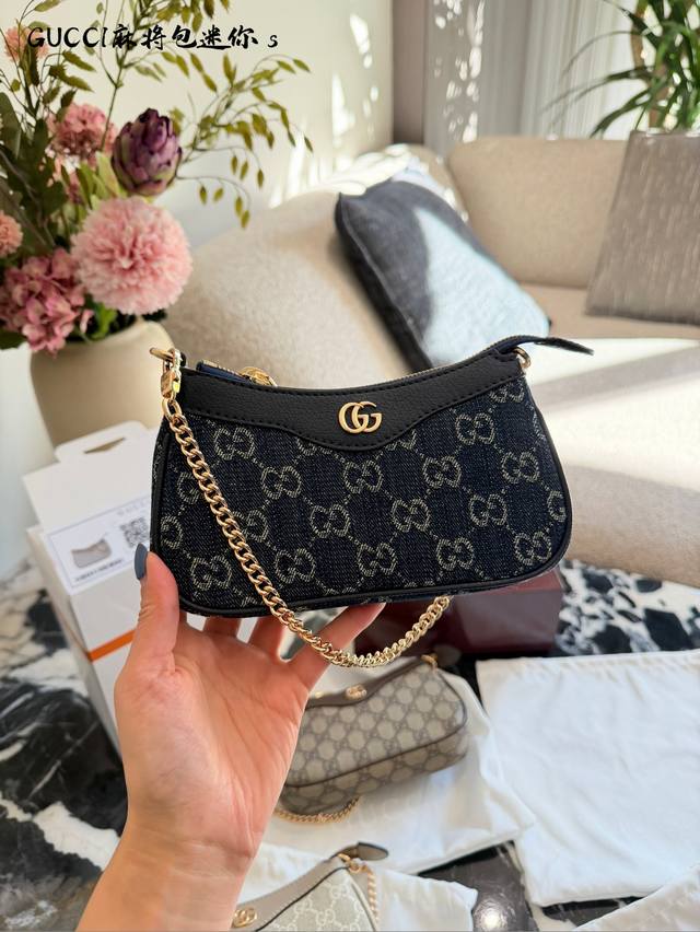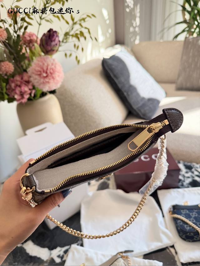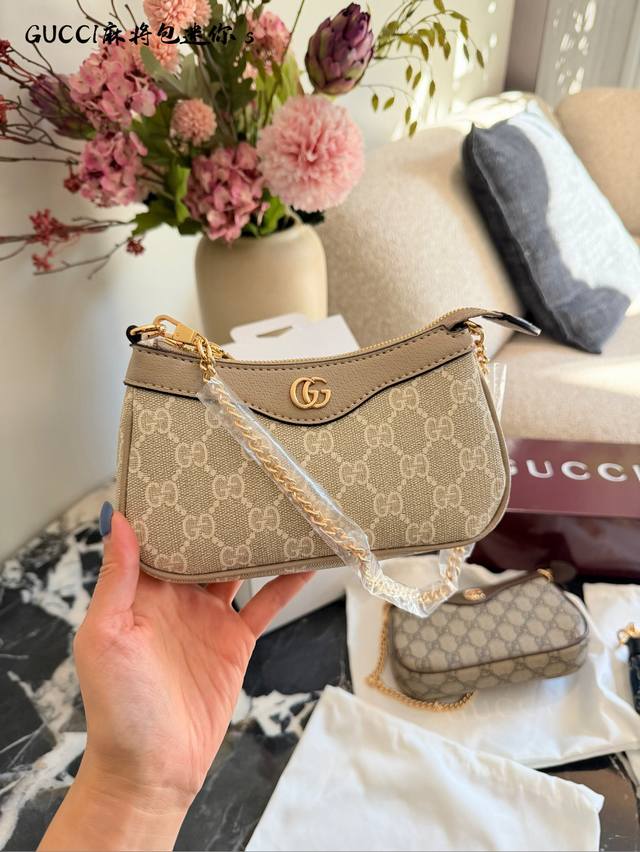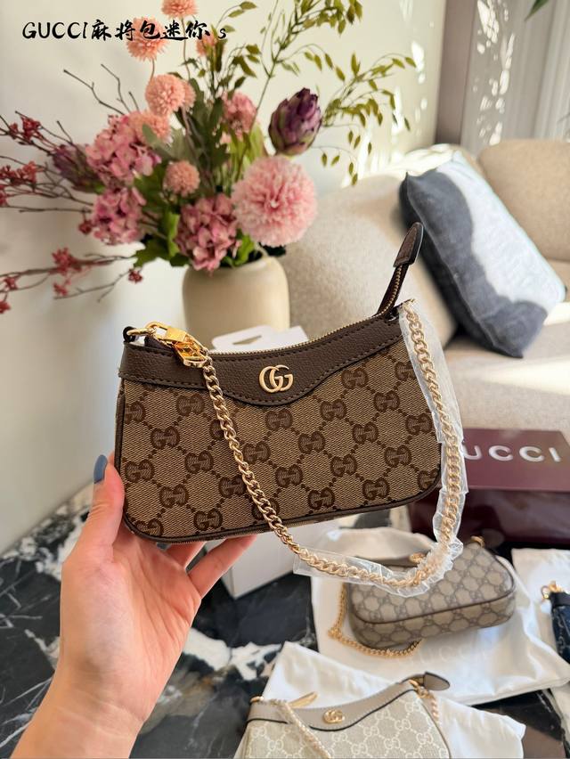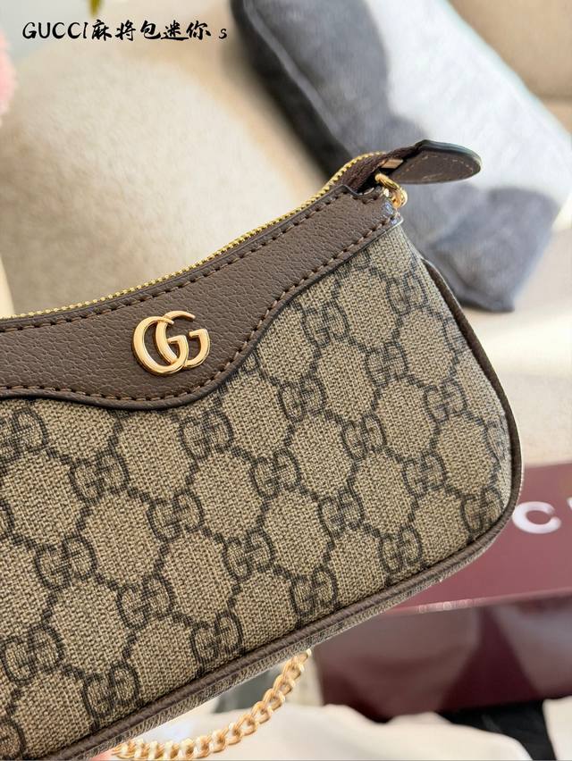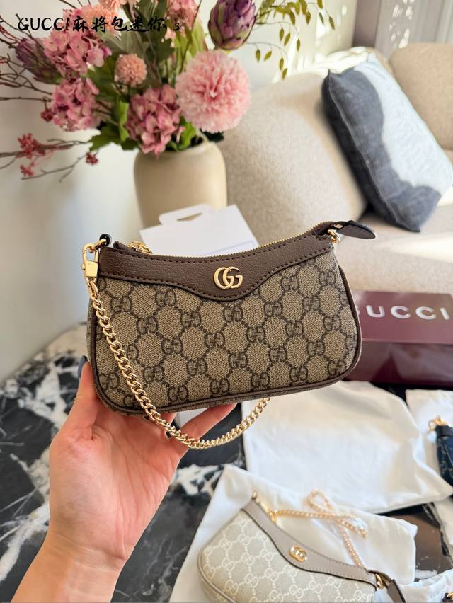 Gucci Ophidia Mini Shoulder Bag. This Gucci Ophidia mini shoulder bag features classic double-G monogram canvas and a metal chain, offering a retro yet stylish look. Measuring approximately 20 x 10 cm, it's small and cute, easily fitting a phone and tissues. The bag is durable, the chain is detachable, and it can be carried by hand or worn under the shoulder