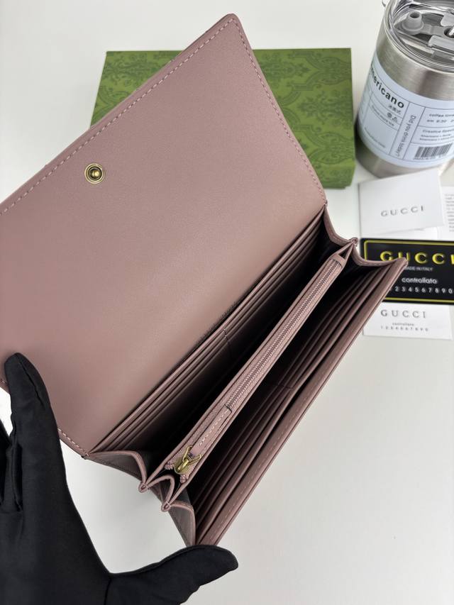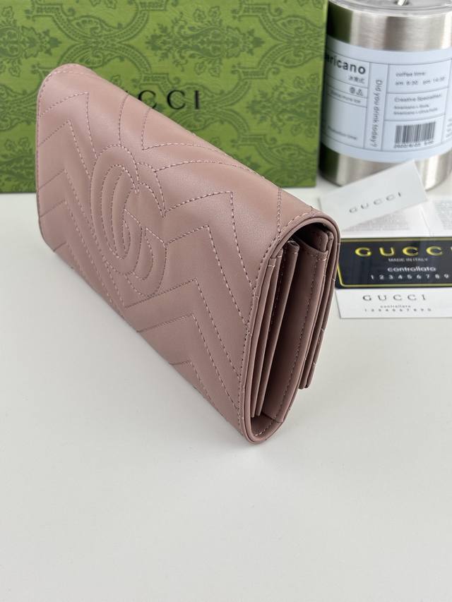 Guccl Gg Marmont Long Wallet crafted from quilted leather with an embroidered Gg logo on the back. Features vintage gold-tone hardware, an Italian-made double G snap closure, 12 card slots, 2 bill compartments, 2 separate internal compartments, and a zippered coin pocket. Model: 443436. Dimensions: 19cm x 10cm x 3.5cm. Color: Pink.