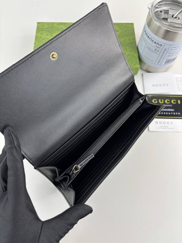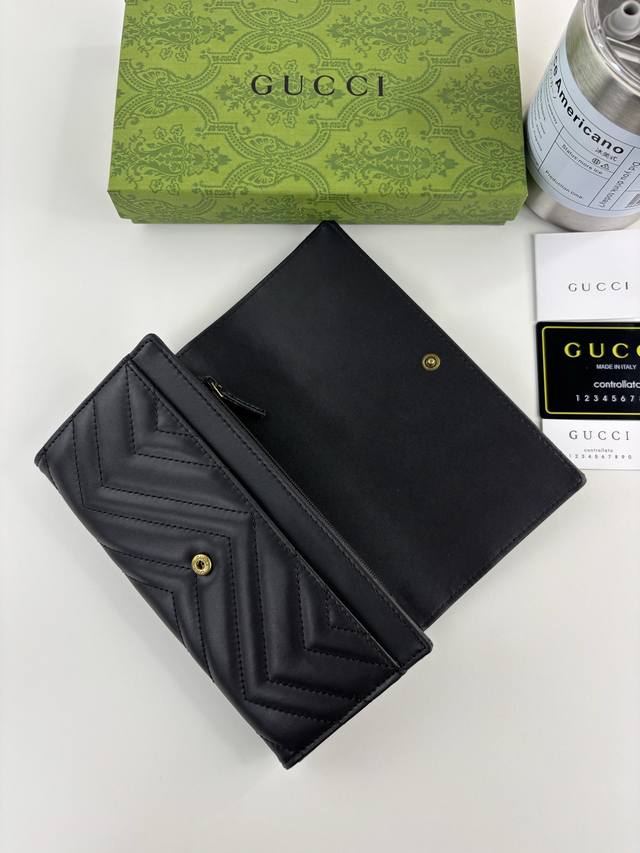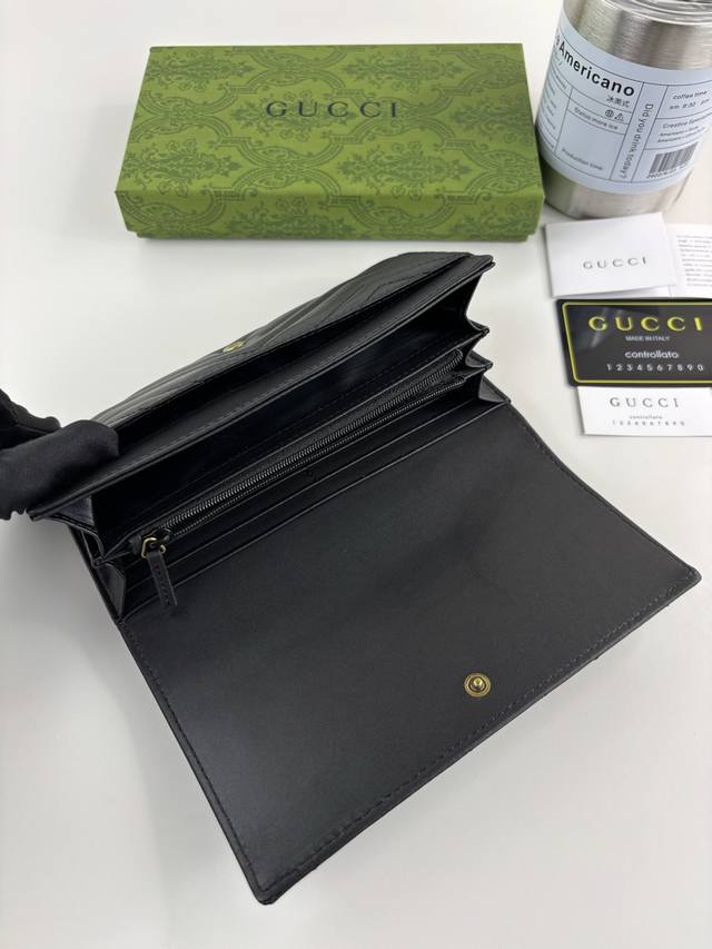 Guccl Gg Marmont Long Wallet crafted from quilted leather with an embroidered Gg logo on the back. Features vintage gold-tone hardware, an Italian-made double G snap closure, 12 card slots, 2 bill slots, 2 separate internal compartments, and a zippered coin pocket. Model: 443436. Dimensions: 19cm x 10cm x 3.5cm. Color: Black.
