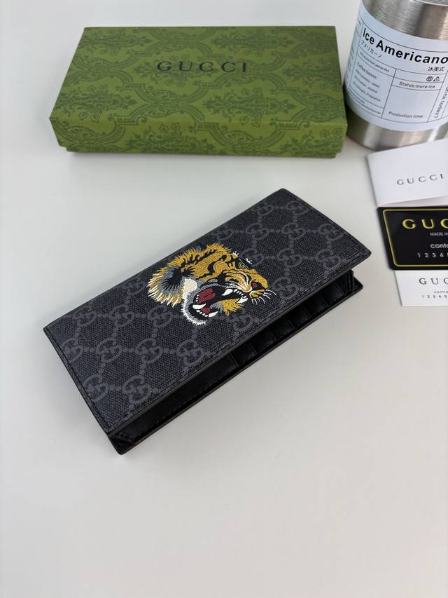 Guccl New Men's Suit Clip! Same style as boutiques, black leather with PVC fabric and silkscreened tiger head logo. Exquisite workmanship, simple and elegant, stylish and powerful. Style No.: 451275 Size: 18cm x 9cm x 2cm Color: Black with tiger head logo
