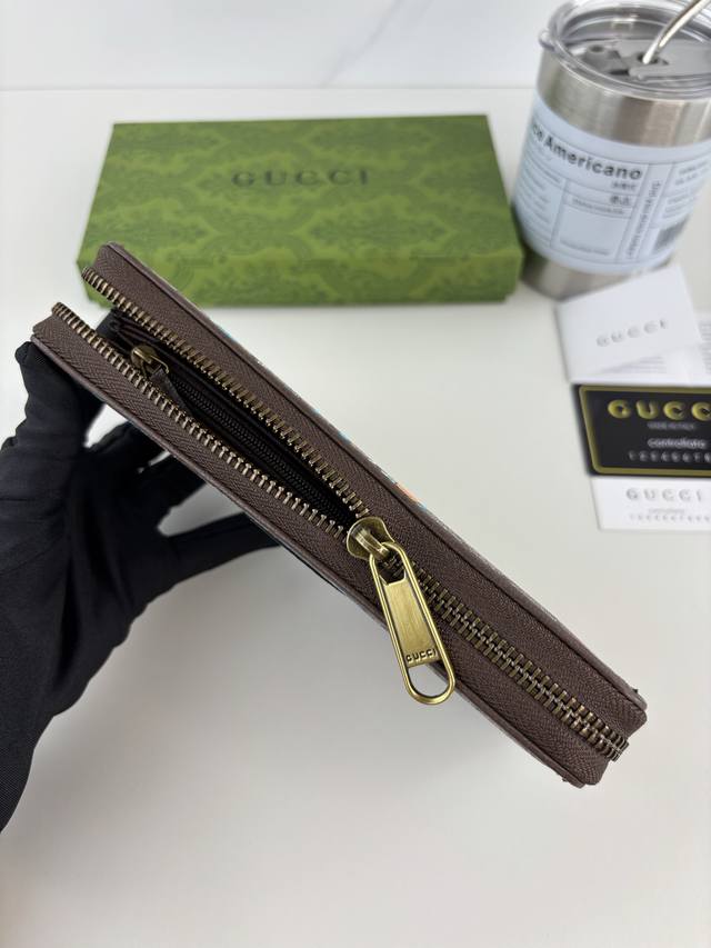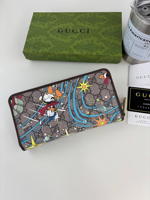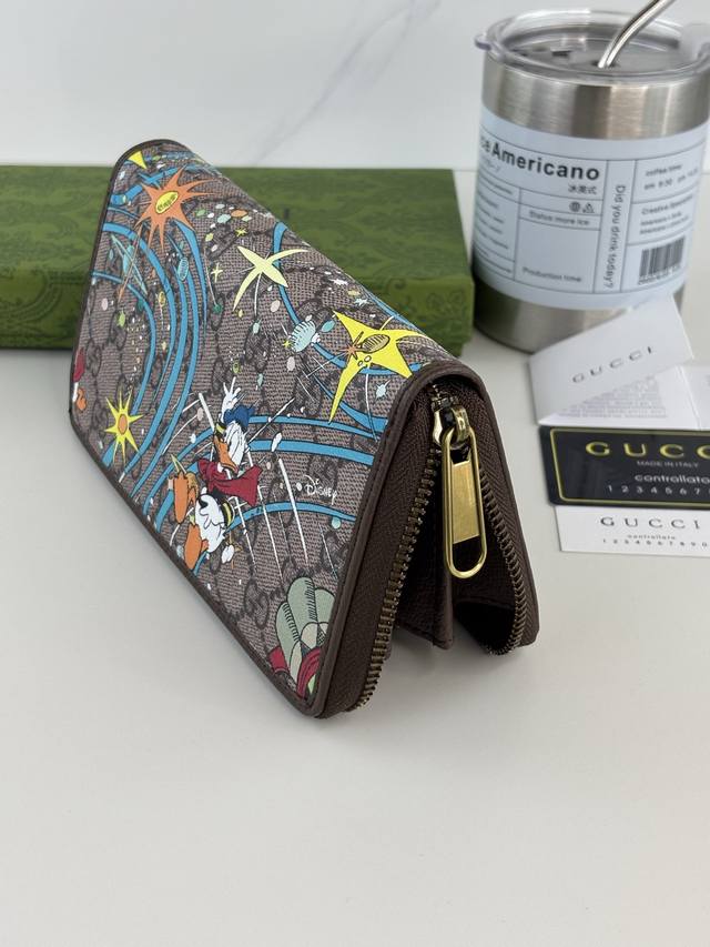 Guccl Supreme wallet continues to draw inspiration from legendary Disney characters, enriching the brand's aesthetic. This sleek, elongated wallet features the likenesses of Donald Duck's three nephews, Hugh Dewey and Louis. Style Number: 647940 Dimensions: 19cm x 10cm x 2.5cm Color: Brown