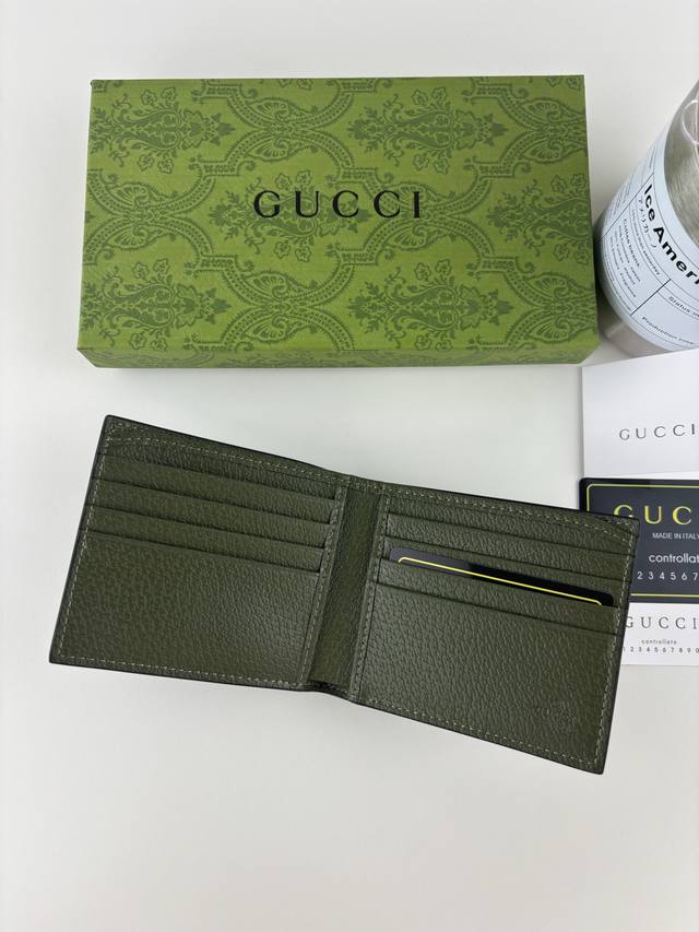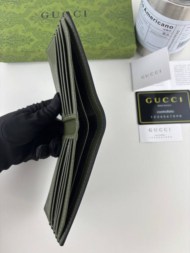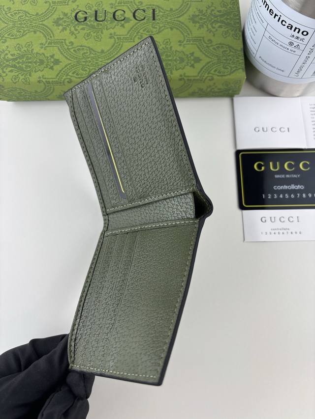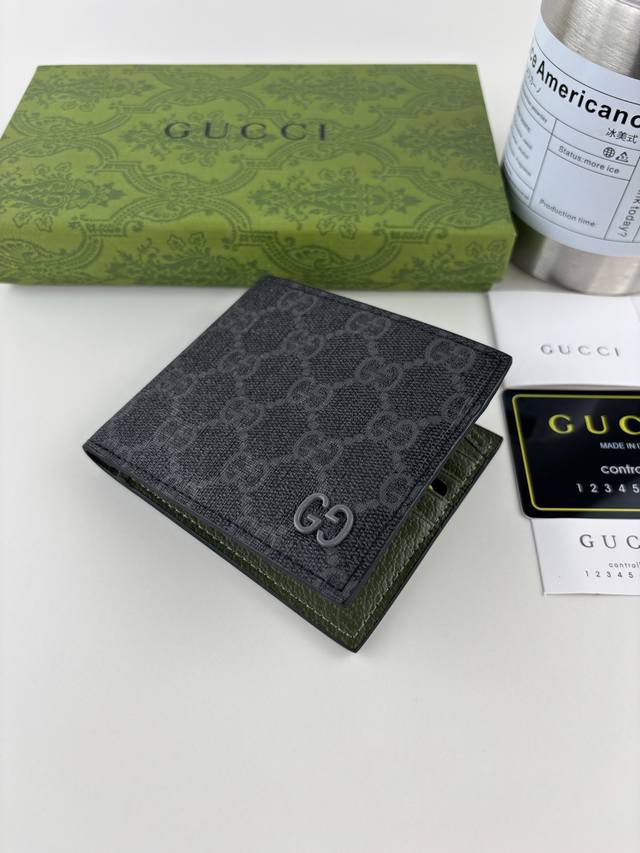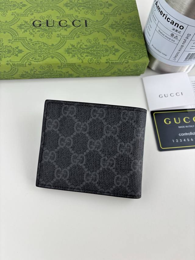Guccl Wallet, a newly launched slim and compact leather item in a collection that blends a variety of vibrant colors. The contrasting two-tone design highlights the Gg logo adorning the wallet. Crafted from black Gg Supreme canvas, the wallet features a grey leather lining and eight card slots and two bill compartments. Style Number: 768243 Dimensions: 11cm
