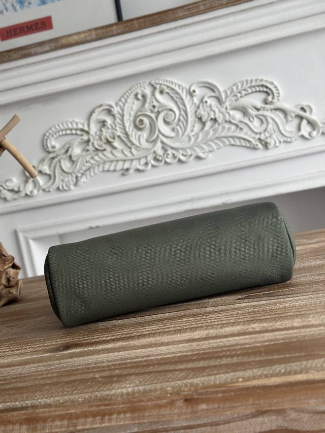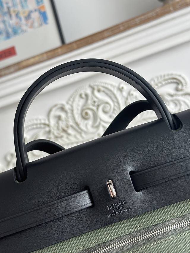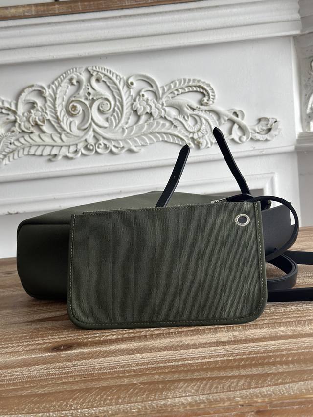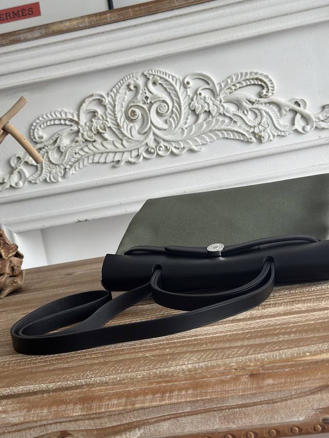 is inspired by saddlebags. The bag body is made of canvas, with leather interior stitching, shoulder strap, and handles. It resembles the Kelly bag in shape, but is much lighter!