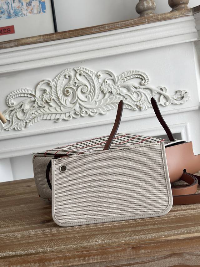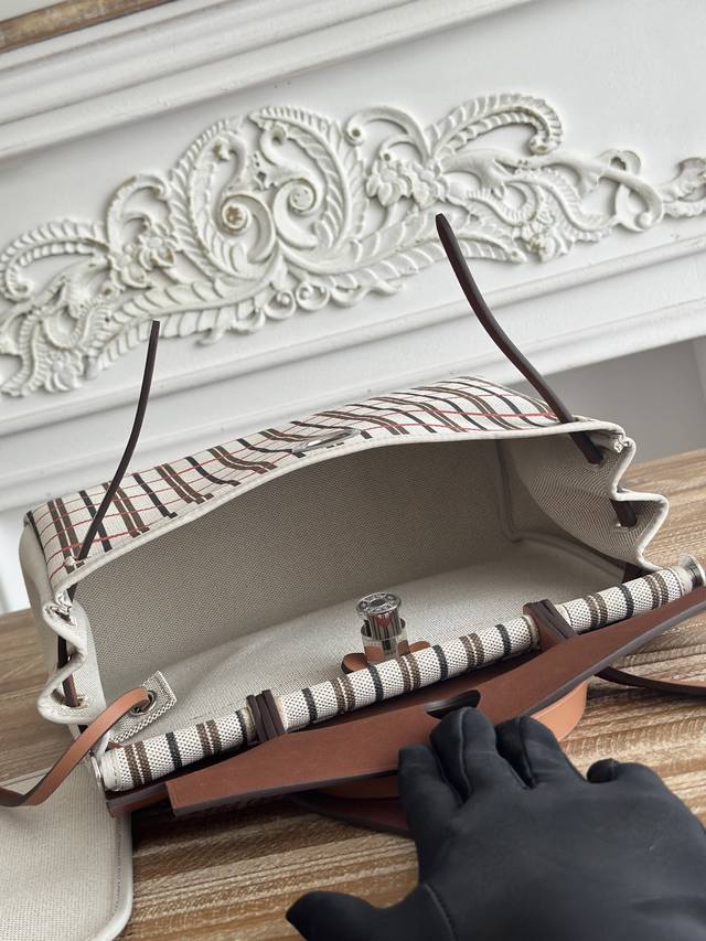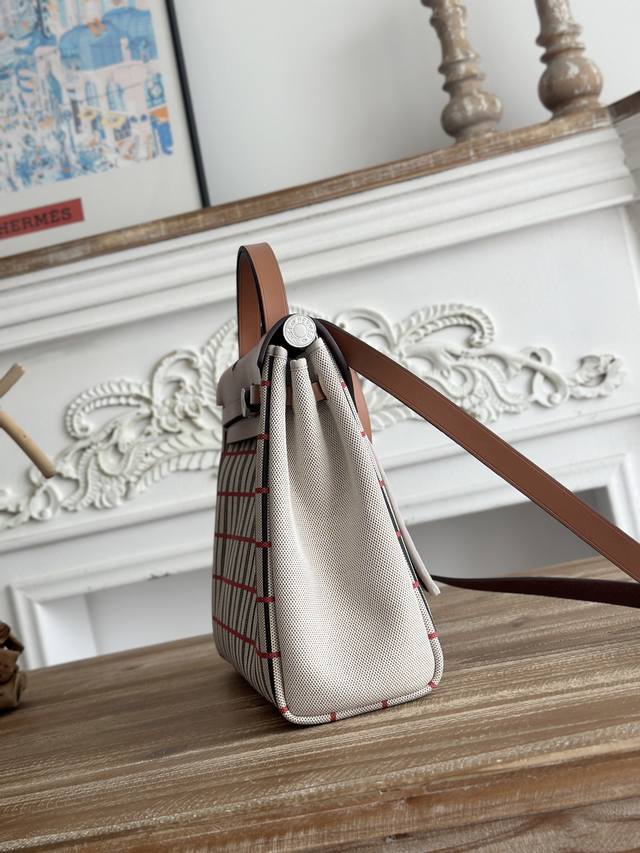 is inspired by saddlebags. The bag body is made of canvas, with leather interior stitching, shoulder strap, and handles. It resembles the Kelly bag in shape, but is much lighter!