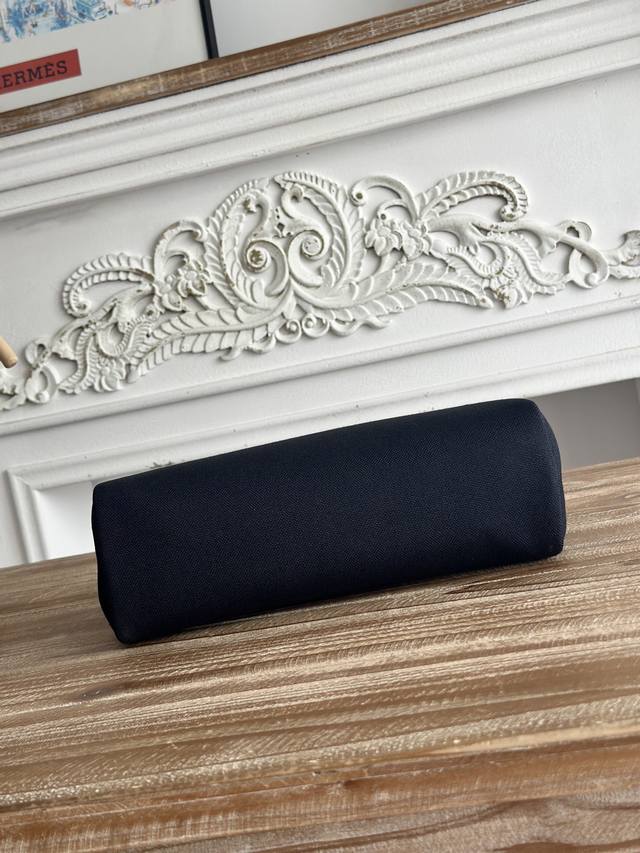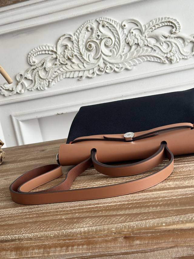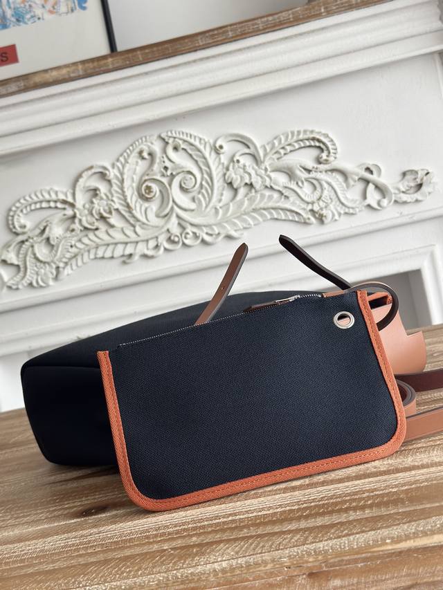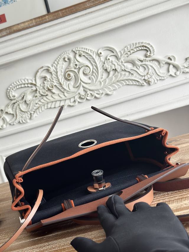 is inspired by saddlebags. The bag body is made of canvas, with leather interior stitching, shoulder strap, and handles. It resembles the Kelly bag in shape, but is much lighter!