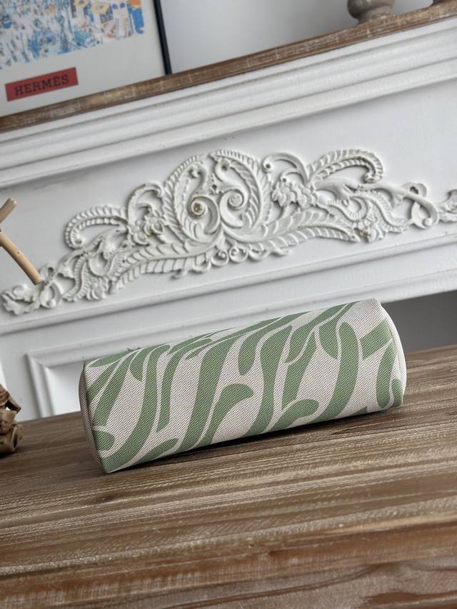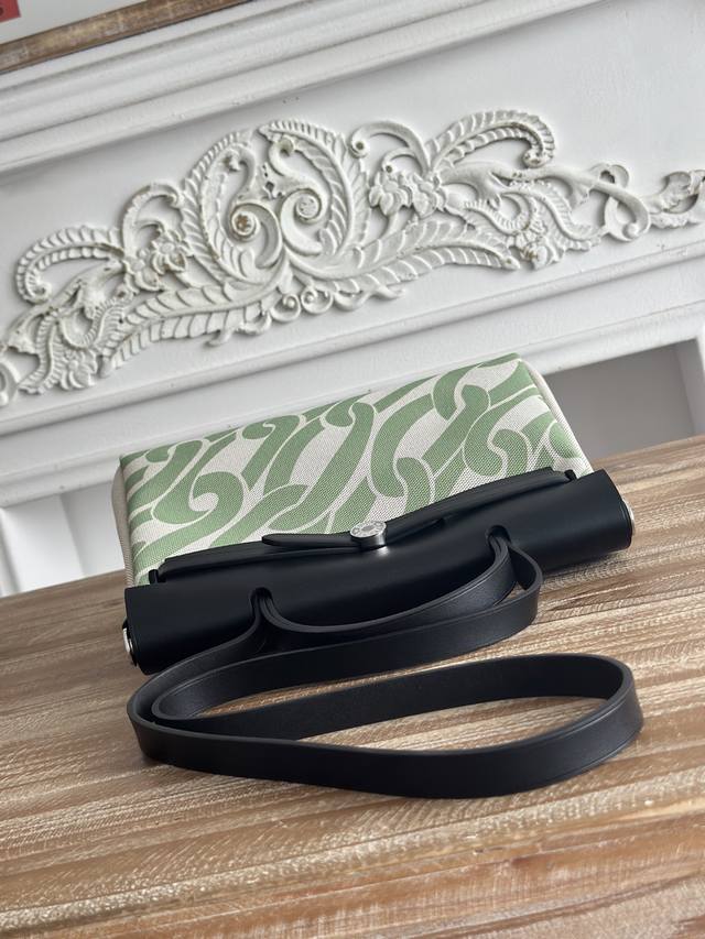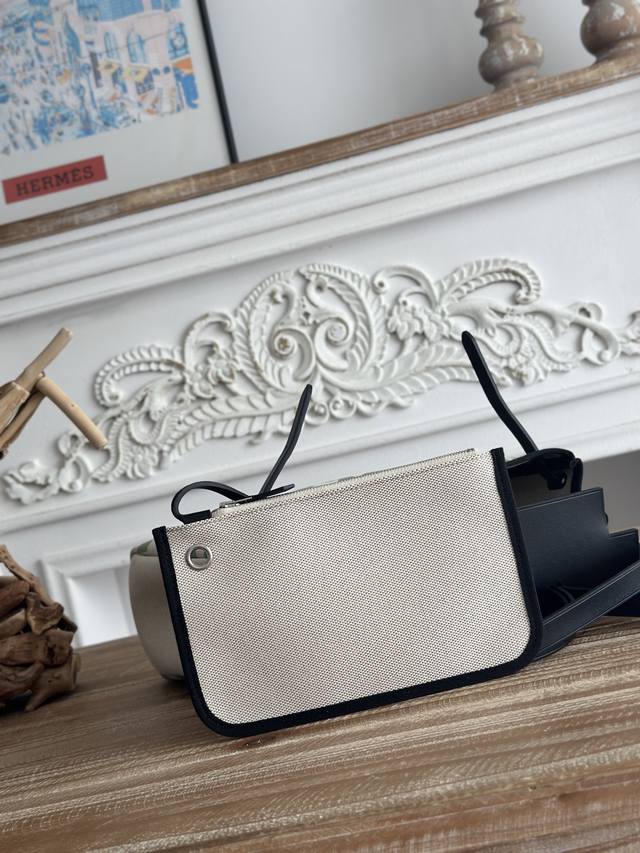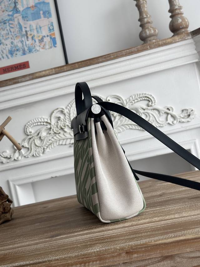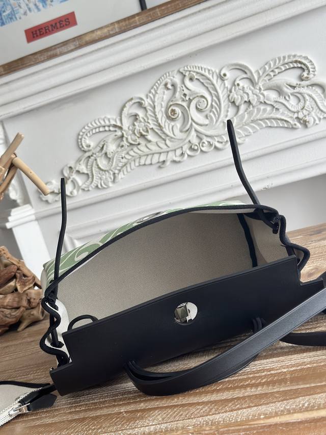 is inspired by saddlebags. The bag body is made of canvas, with leather interior stitching, shoulder strap, and handles. It resembles the Kelly bag in shape, but is much lighter!