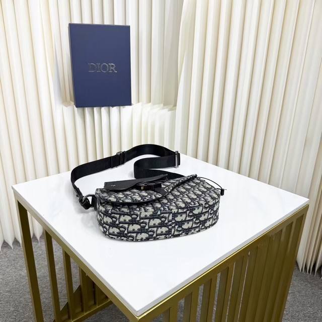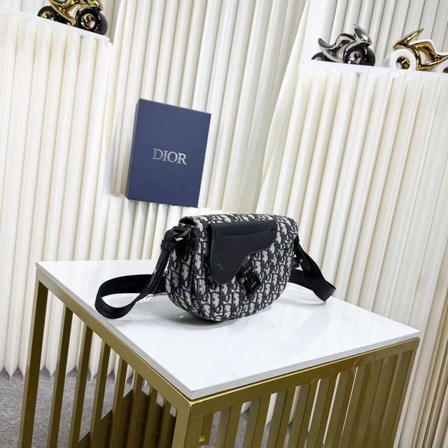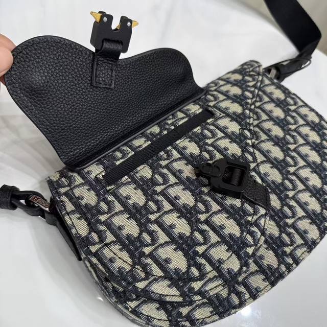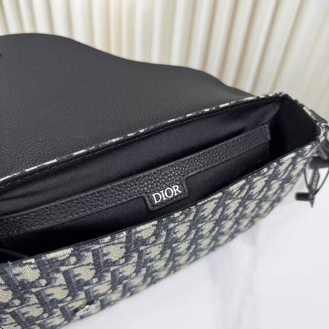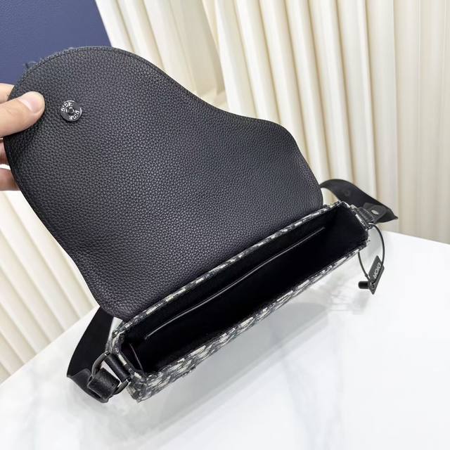 Item Number: 1Adpo325Yky_H27E. This Saddle Messenger bag is a new addition to the Fall 2024 menswear collection, exquisite and stylish. Crafted from beige and black Oblique printed fabric, it features a black grained calfskin saddle flap, accented with aluminum buckles for added sophistication. The spacious interior includes a slip pocket for everyday essentials and comes with an adjustable Christian Dior nylon jacquard shoulder strap for shoulder or crossbody wear.
