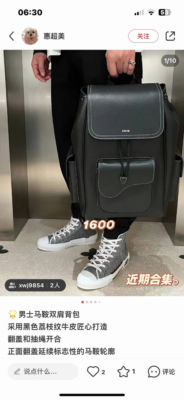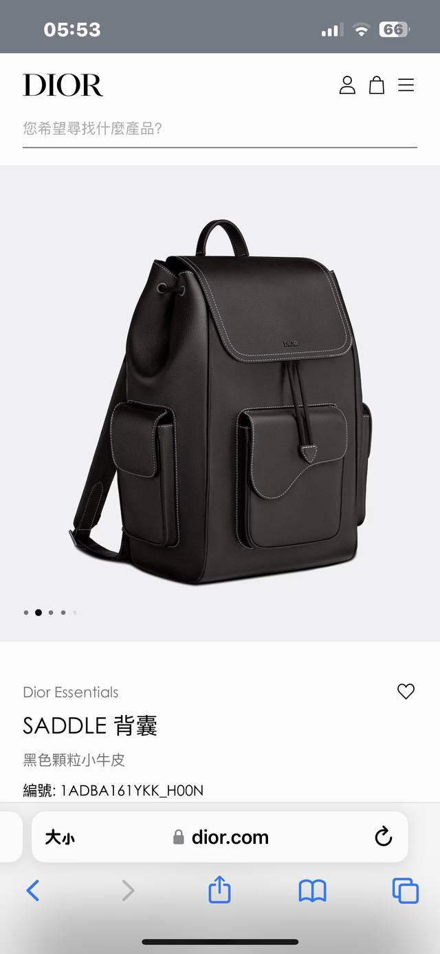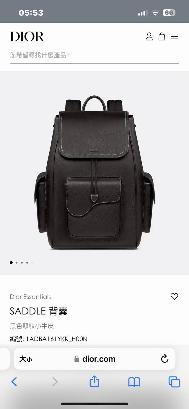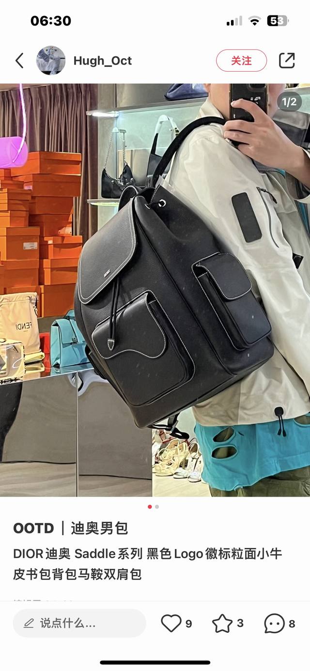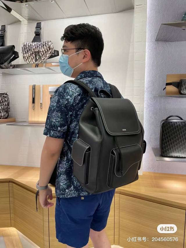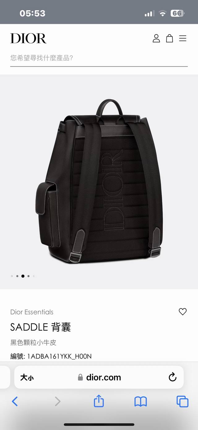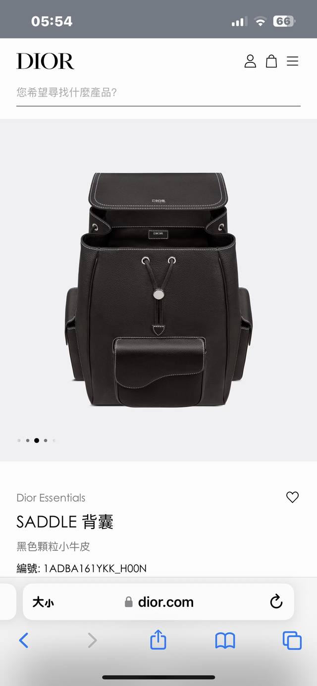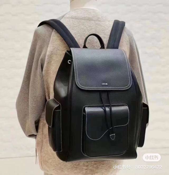 Highest version on the market, welcome to compare. Dior Essentials Saddle Backpack, Black Grained Calfskin, Item No.: 1Adba161Ykk_H00N. The Saddle Backpack infuses the Saddle design with style and originality. Black grained calfskin is accented with contrasting stitching, and the Dior logo is adorned on the front. The spacious design features one compartment to hold all your essentials. It has a Saddle flap pocket on the front and two flap pockets on the sides, perfect for wallets, keys, earphones, or phones. This practical backpack complements any look. Black grained calfskin with contrasting stitching. Front adorned with a naphthalene-finish brass Dior logo. Interior embossed Dior logo. Flap and drawstring closure. Padded mesh adjustable shoulder strap. Leather top handle. Back reinforced with Dior signature stitching. Front pocket and flap side pockets. Interior laptop compartment. Includes dust bag. Made in Italy. Dimensions: 26.5 x 40 x 17.5 cm (10.5 x 15.5 x 7 inches Length x Height x Width). Main compartment can hold one 15-inch laptop, multiple documents, and one tablet. The side pocket can hold an iPhone 13 Pro Max.