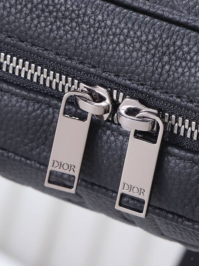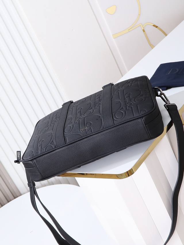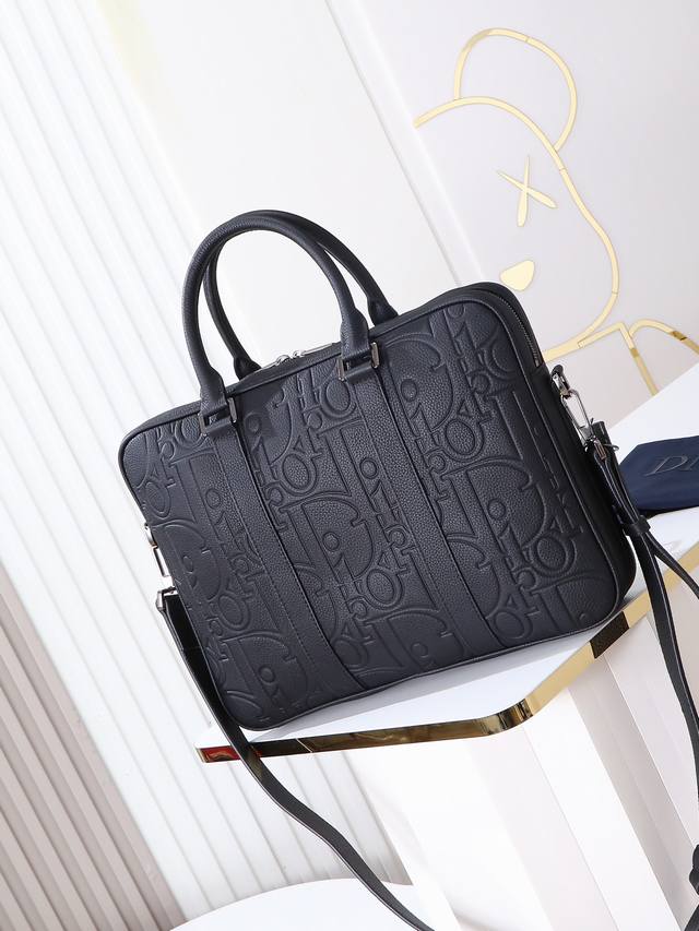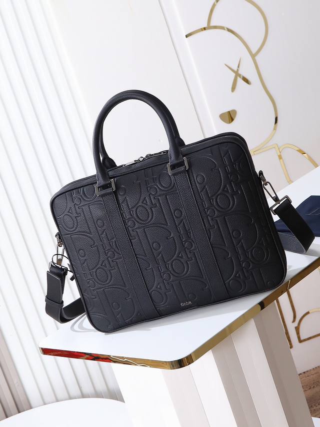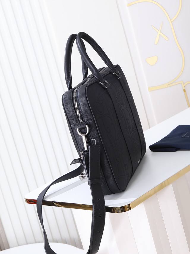 Item Number: 1Esbr180Llg_H00N. This zipper briefcase blends classic elegance with Dior's haute couture spirit. The Dior Gravity printed leather features an embossed pattern that exquisitely presents the classic pattern on black calfskin, accented with tonal grained calfskin details. The front is adorned with the Dior logo, showcasing the exquisite craftsmanship of the Dior atelier. It has a zipper closure and a spacious interior with a quilted laptop compartment. It comes with a foldable handle and an adjustable, detachable shoulder strap, allowing it to be carried by hand, over the shoulder, or crossbody.