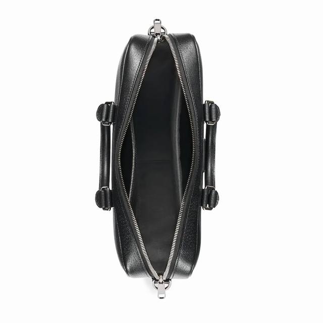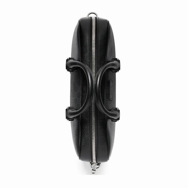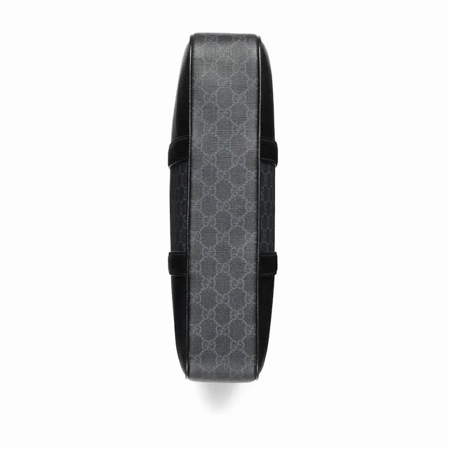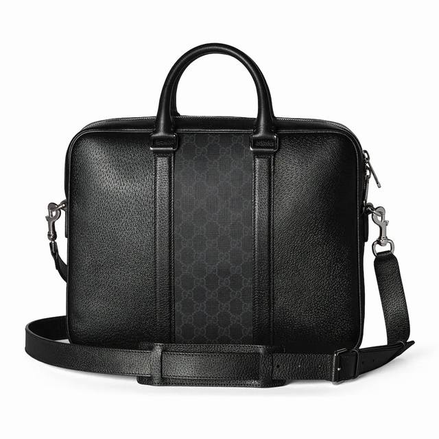 . Description: This briefcase and tote bag showcases a fresh style through practical details. Crafted from black leather and Gg Supreme canvas, it features a laptop compartment and an adjustable shoulder strap. The "Made In Italy" leather tag adds an elegant touch of brand identity.