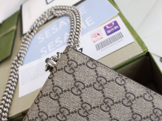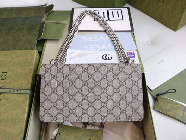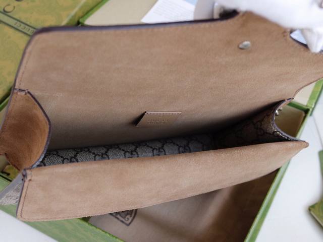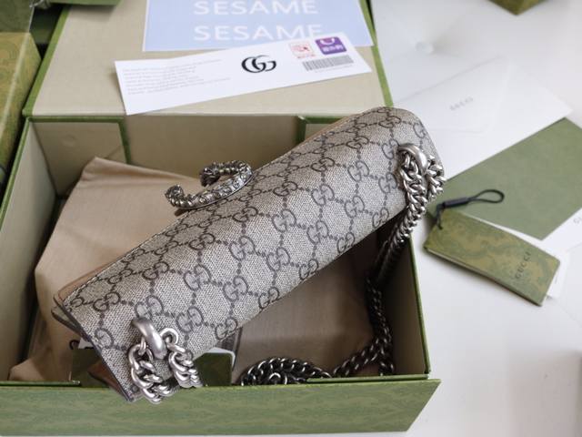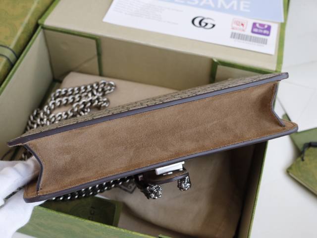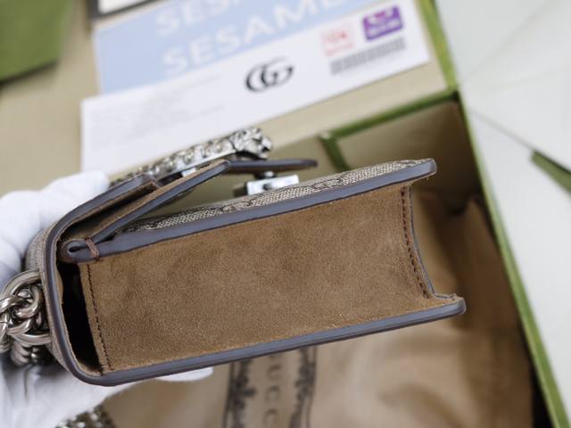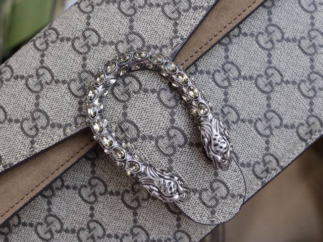 High-volume selling price. Description: This small Dionysus shoulder bag features the classic GG pattern and red suede piping details. It's adorned with the brand's iconic tiger head buckle, inspired by the Greek god Dionysus, who, in mythology, rode a tiger sent by Zeus across the Tigris River. Sparkling crystal embellishments add a touch of luxury. The sliding chain strap allows for versatile carrying options, easily switching between a shoulder bag and a handbag. Model 499623. The actual product shown is 420 quality. Made of high-quality genuine suede cowhide with meticulously engraved antique bronze hardware; the texture is clear and easily visible, showcasing the highest quality. Dimensions: 25 x 13.5 x 7 cm. Sf- 201743Ww.