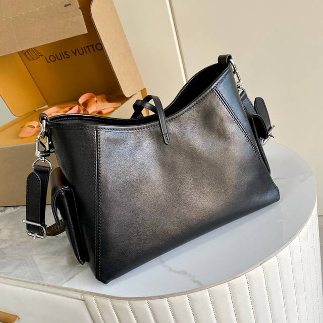 Internal Price (Chip Version) Style No.: M24861 Black, Original Enhanced Version, Exclusive Real Shot Background Image. This Carryall Cargo Small Handbag features soft lambskin leather with a stylish slightly wrinkled effect. Polished metal hardware and a relaxed silhouette complement a deep background, making it a perfect choice for day or night. The detachable shoulder strap and chain strap allow for multiple styling options. Size: 33.5 x 23 x 15 cm.