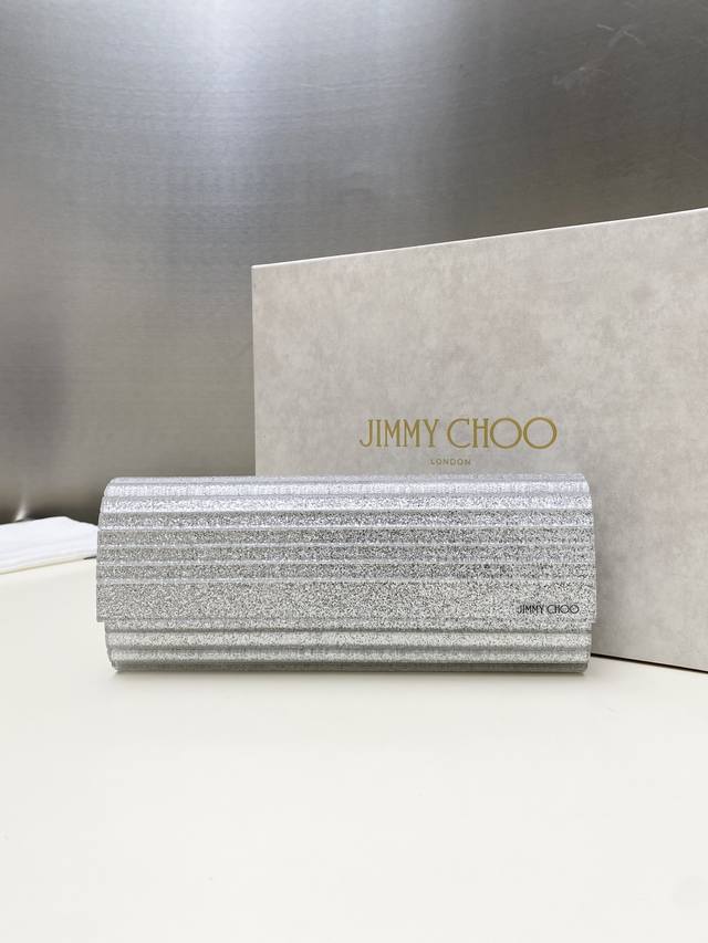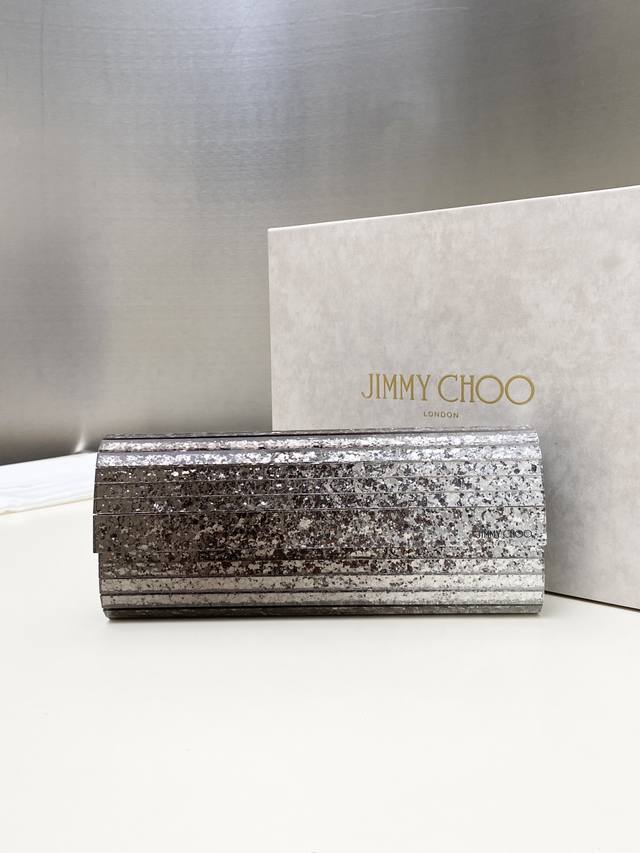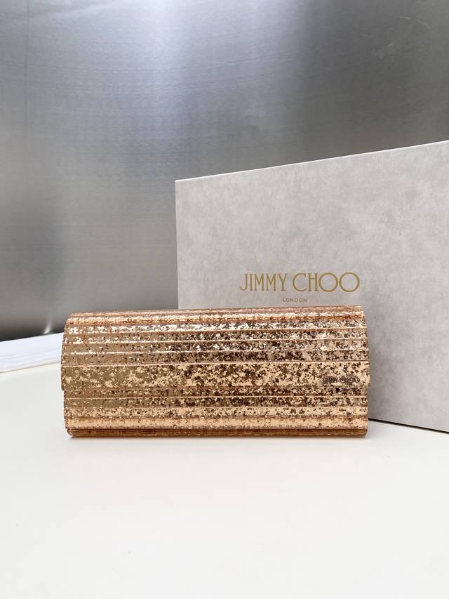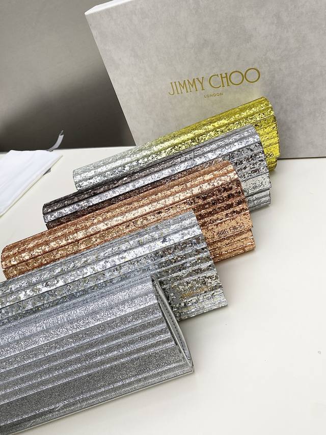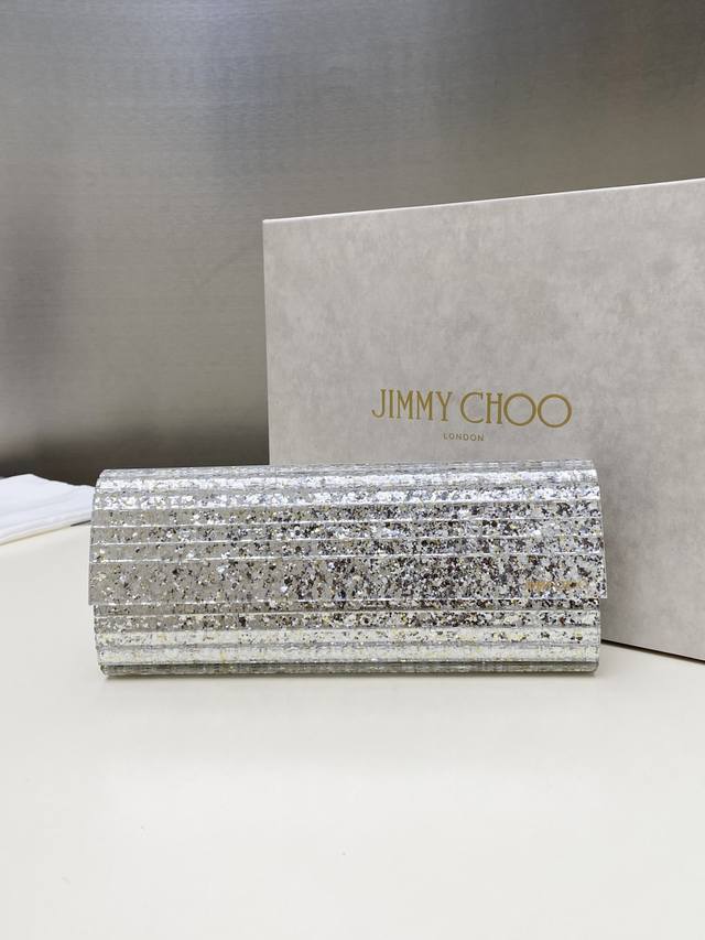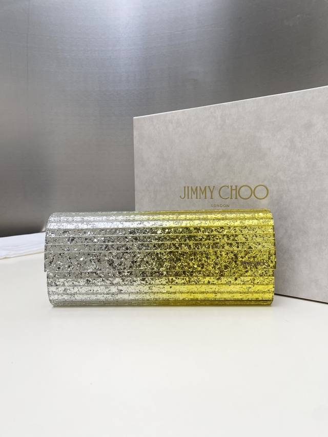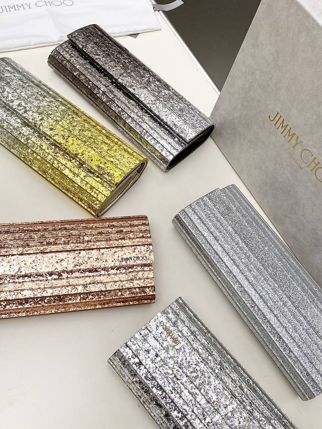 Jimmy Choo Sweetie clutch bag. With its clean lines and smooth, rounded shape, it exudes a modern feel. The gradient glitter instantly transforms you into the center of attention at any evening event. It can be carried by hand or worn over the shoulder with the long chain loop strap. Features include: glitter acrylic detachable long chain loop shoulder strap, leather accordion pleats, magnetic snap closure, interior slip pocket, Jimmy Choo logo embossed leather, 24 cm (L x 10 cm, H x 5 cm), maximum shoulder strap length: 44 cm.