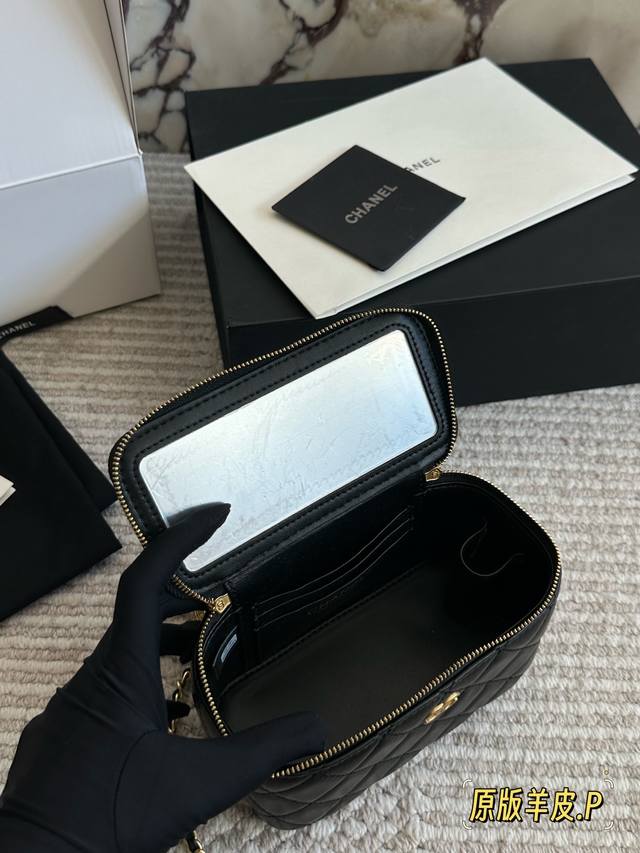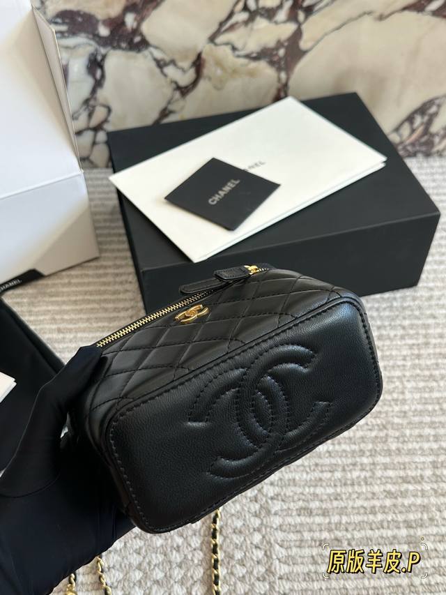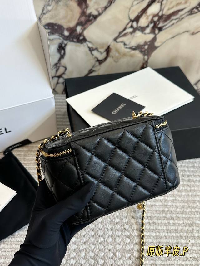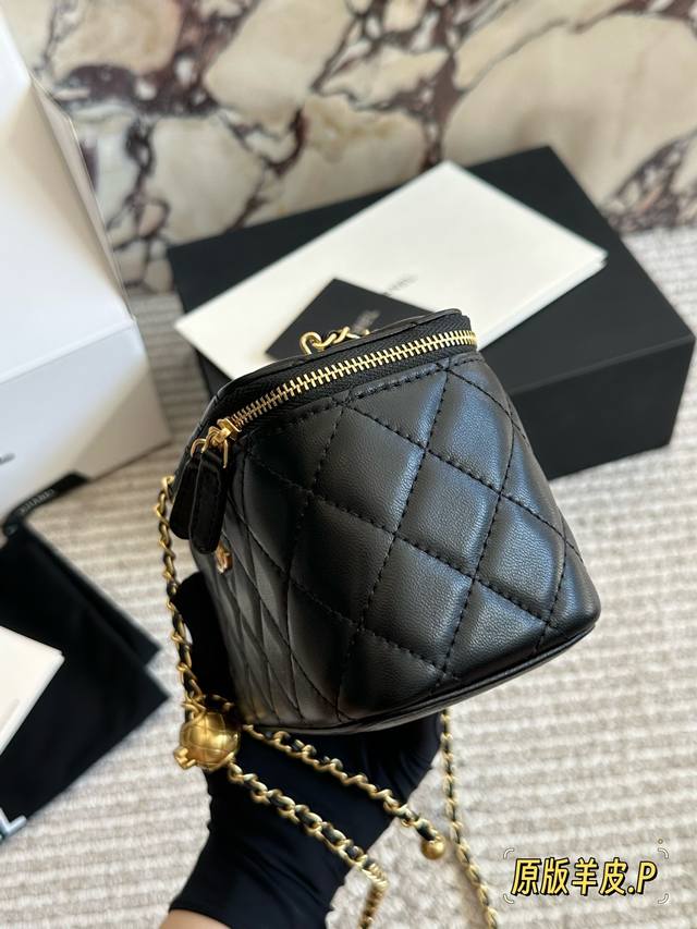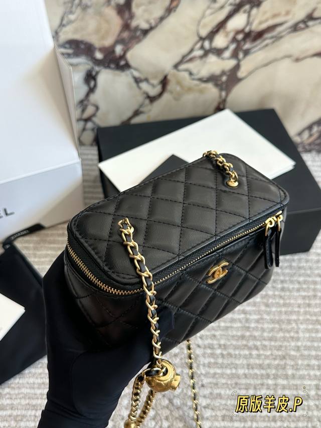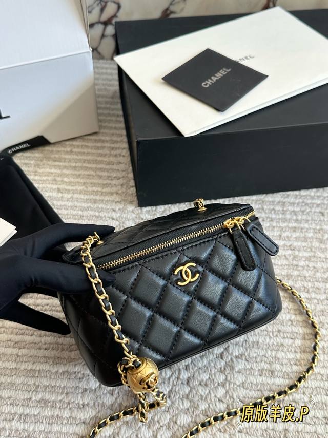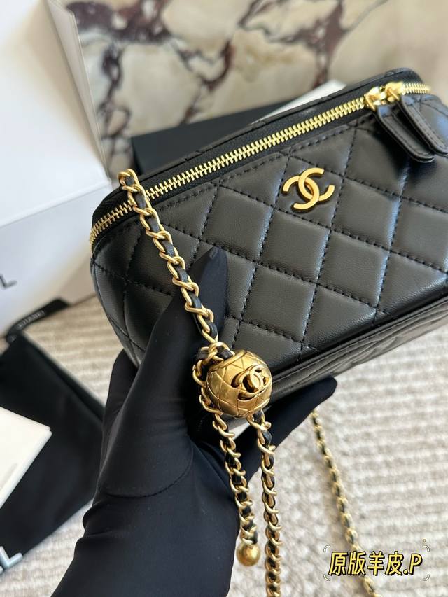 Lambskin Chanel Classic Gold Ball Box Bag A timeless classic, the "Gold Ball Box Bag" is incredibly cute in person. It features an interior mirror and is also known as a "makeup bag." Made of practical lambskin, it's paired with light gold hardware and a small logo on the handle