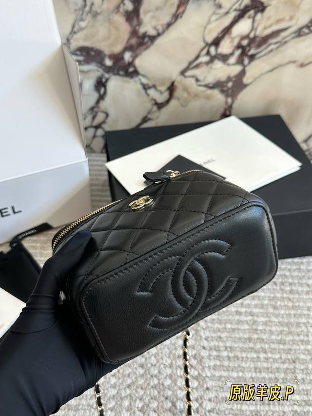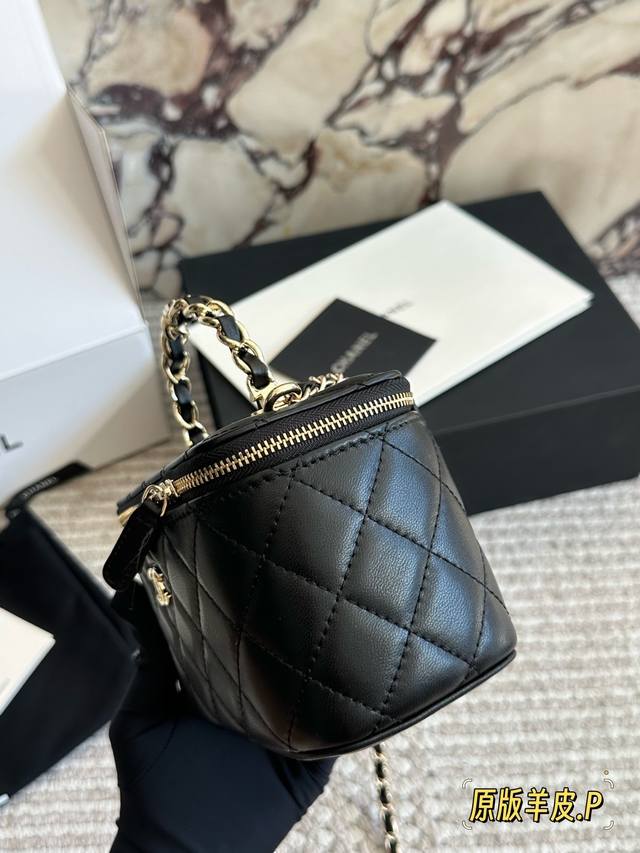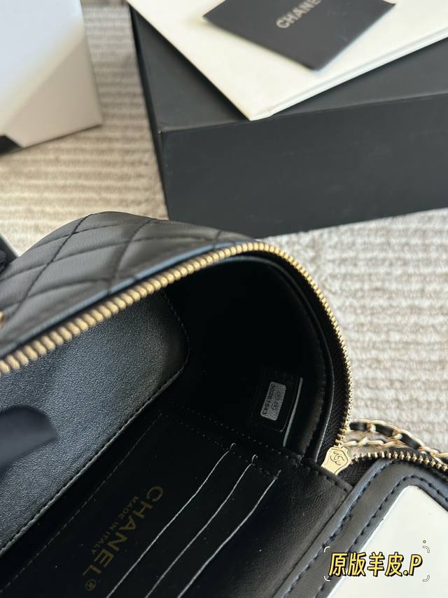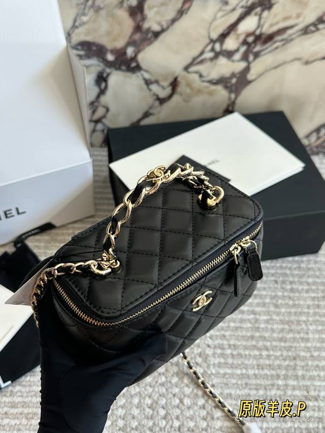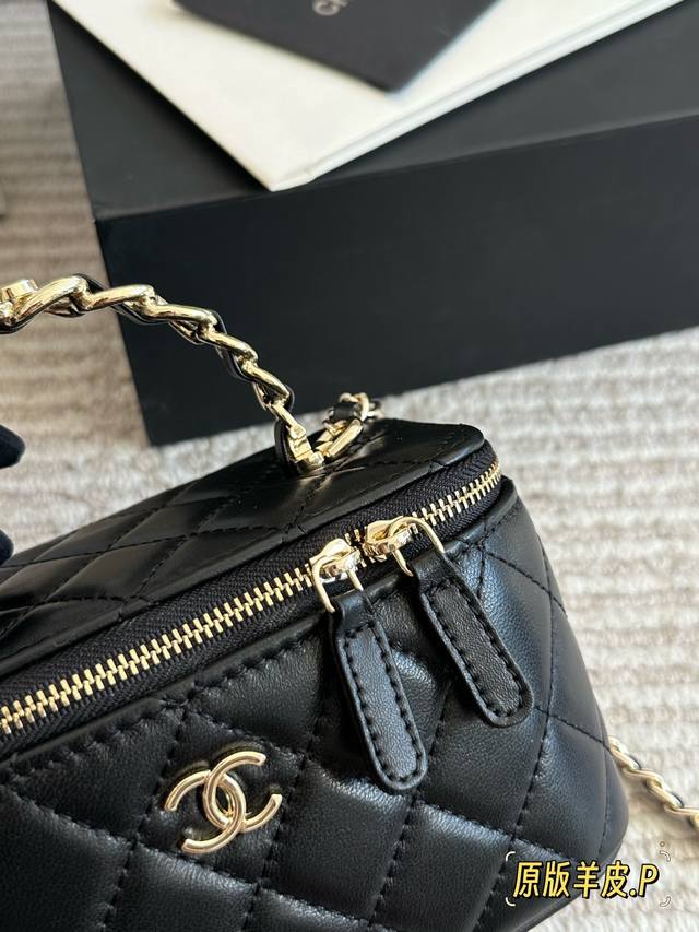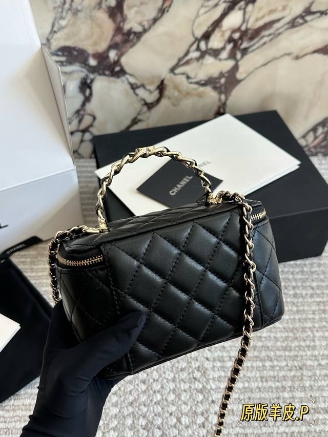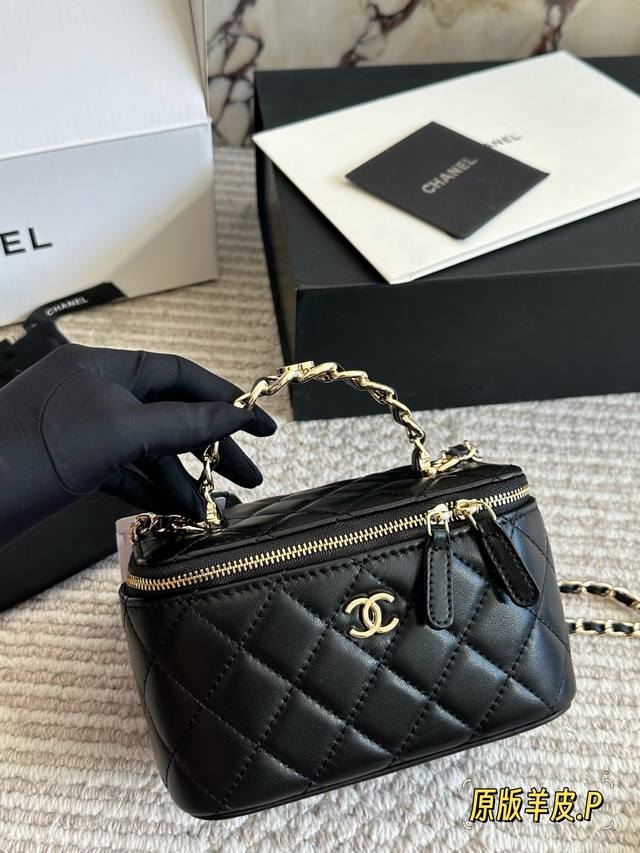 Lambskin Chanel Classic Handle Box Bag A timeless "handle box bag" that's incredibly cute in person. Features an interior mirror, also known as a "makeup bag." Highly practical lambskin with light gold hardware, and a small logo on the handle