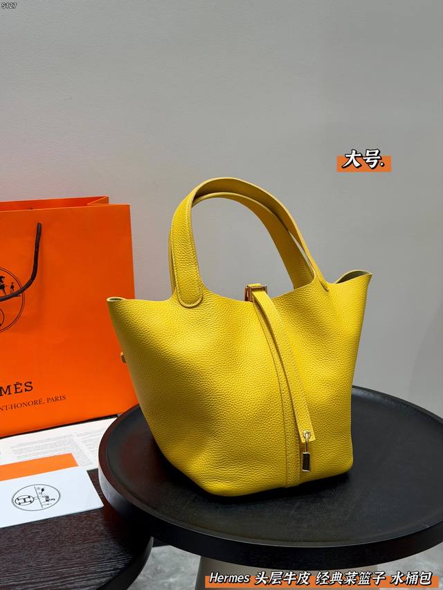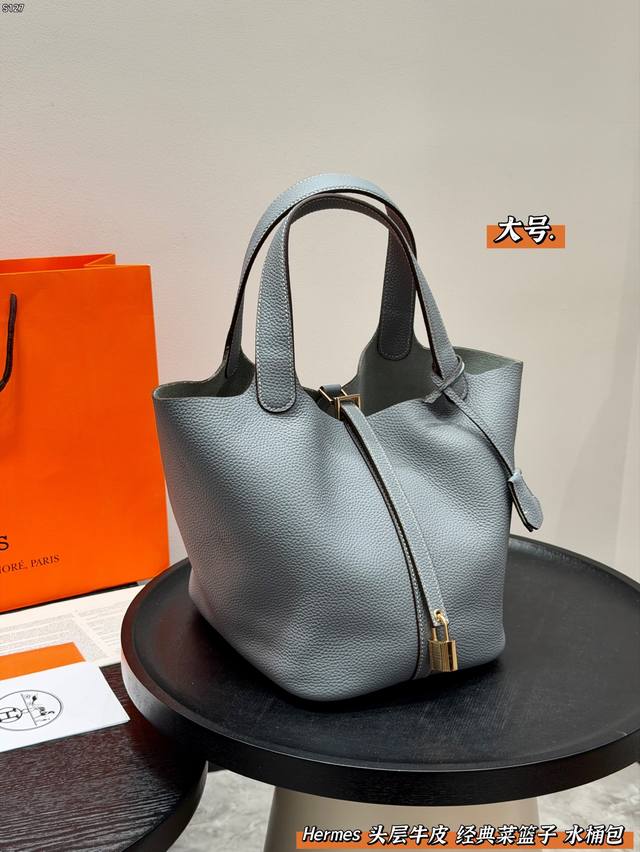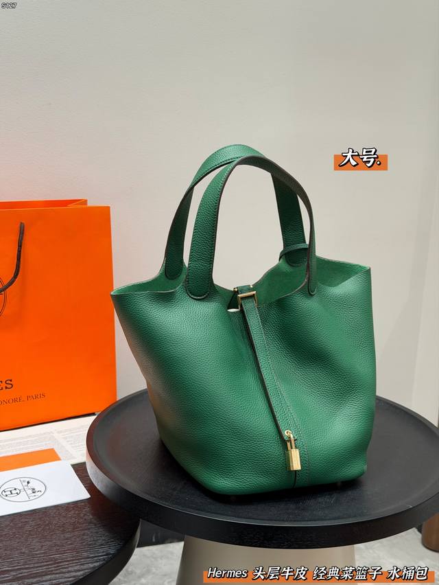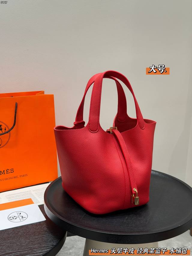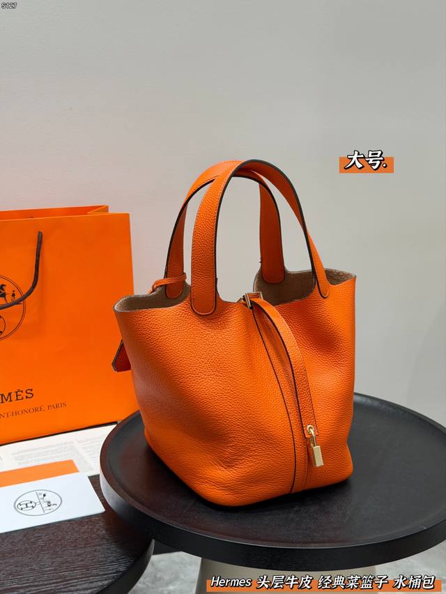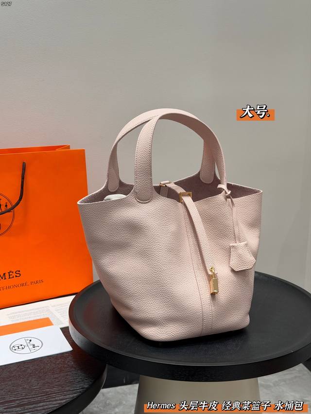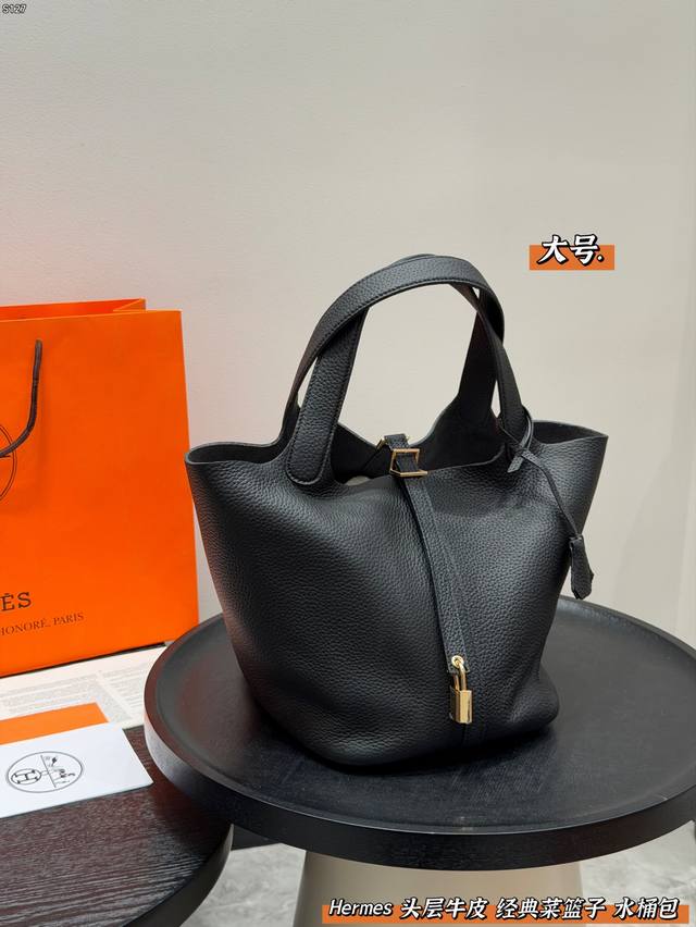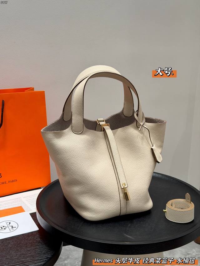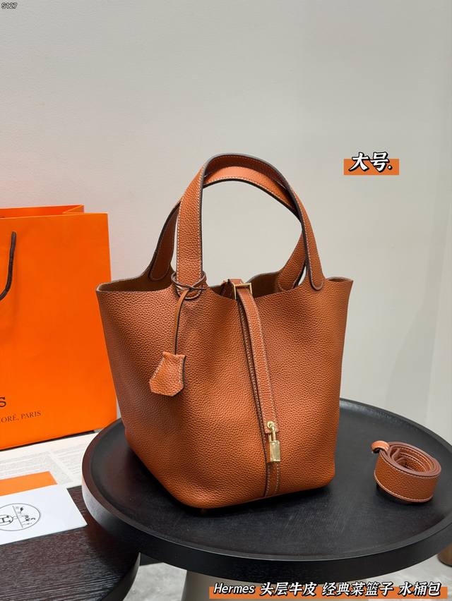 Large complete gift set with inner liner! Size: 21*22cm. Hermes basket bag style. Top-grain cowhide leather with waxed thread. Comes with a silk scarf and a small horse design. The leather is very high-quality and has a nice drape! The small padlock detail is just right.