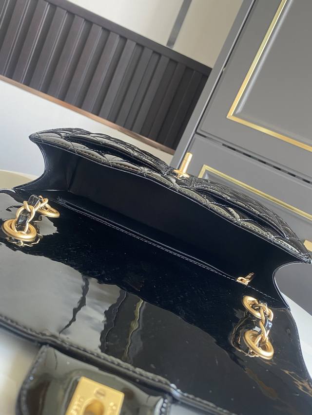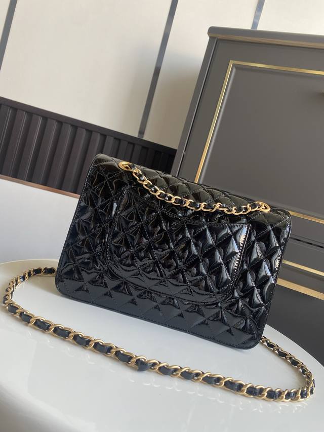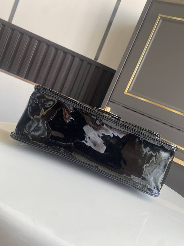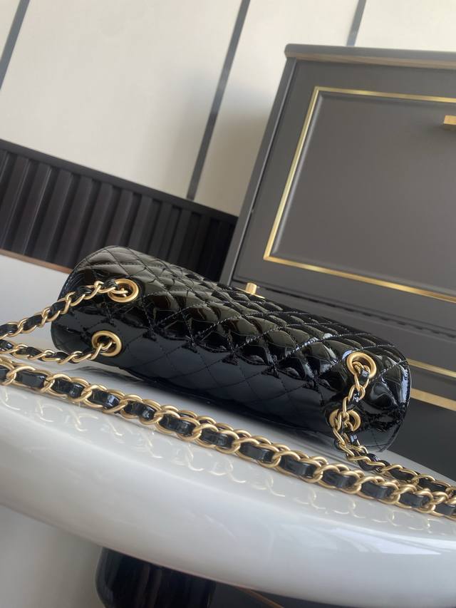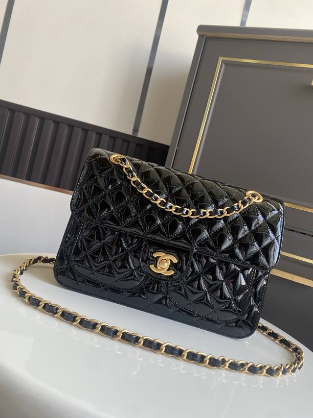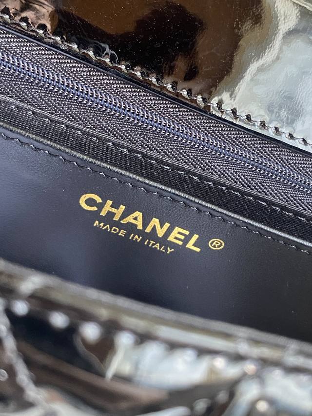 in black patent leather. Very similar to the Mini CF in its quilted design and double C logo, making it highly recognizable! The chain is adjustable, so it can be carried by hand, over the shoulder, or crossbody, making it suitable for everyday commutes or formal occasions. It has a moderate capacity, easily holding a phone, lipstick, and power bank
