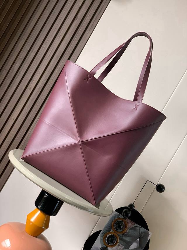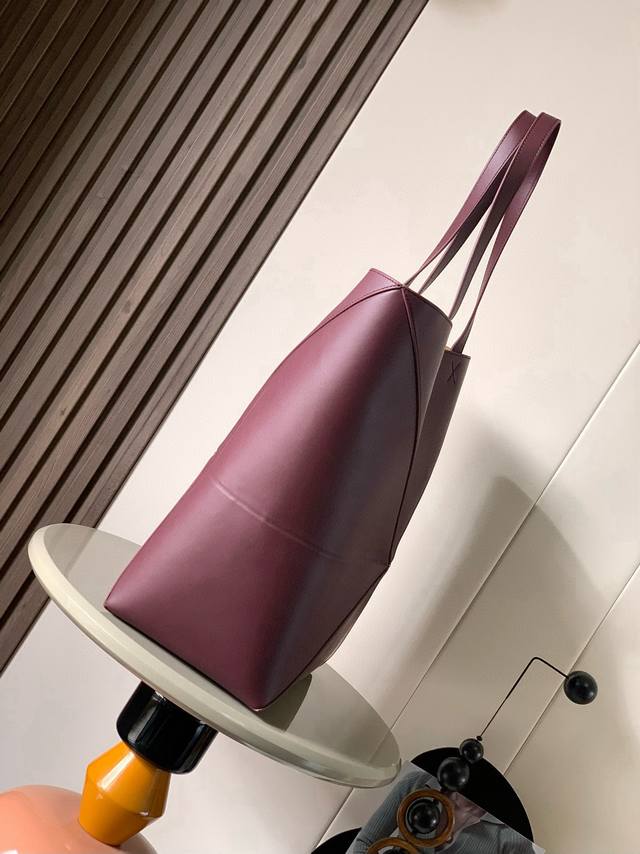Large New Glossy Calfskin Tote Bag Puzzle Fold Handbag. This large tote bag features a geometric design that's so practical and stylish I haven't seen in a long time. Continuing the geometric aesthetic of the Puzzle series, inspired by origami bags, this Puzzle Fold Tote effortlessly switches between three-dimensional and flat designs. Two sizes are available for reference: the large size offers better capacity, while the small size is adorable. The leather is incredibly fine and glossy, and the bag itself is super lightweight and foldable, making it perfect for everyday commuting with a laptop, or for frequent business trips like mine