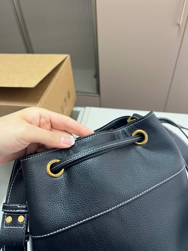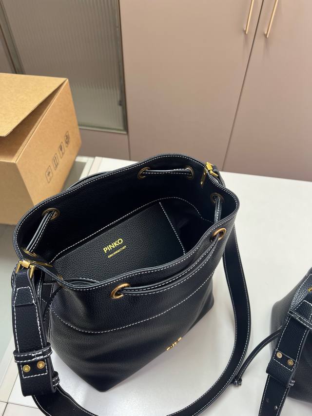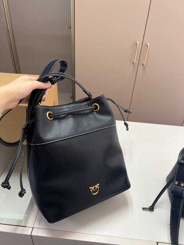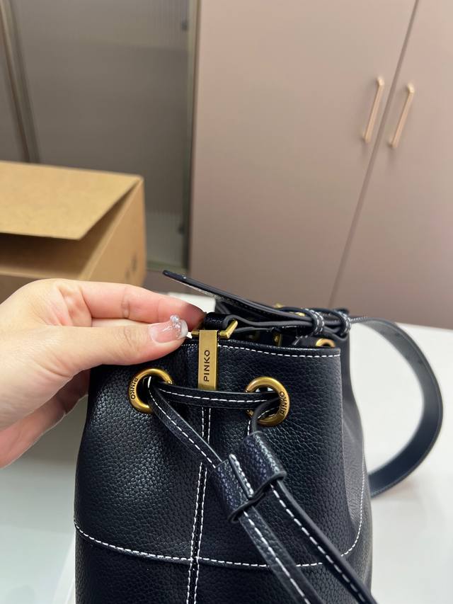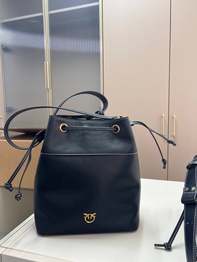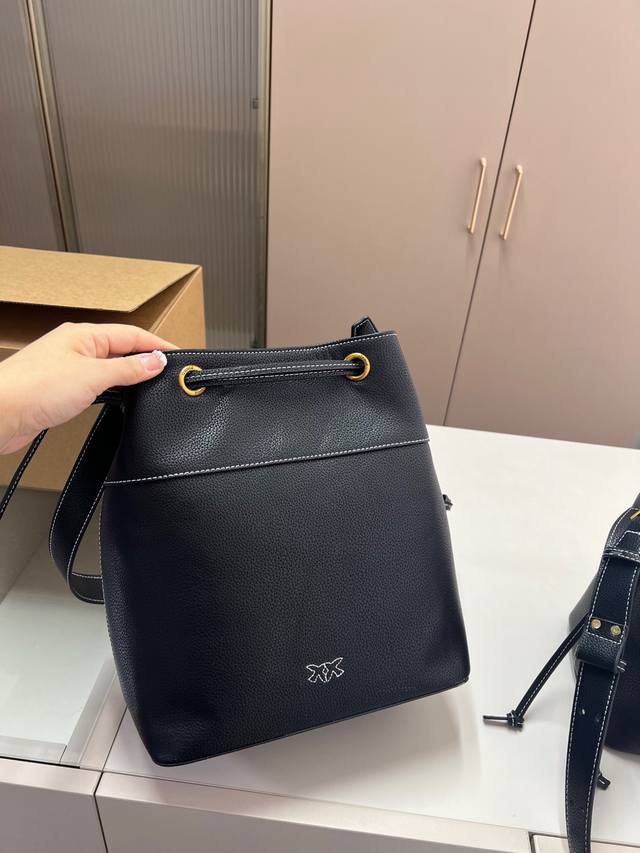 Large Pinko drawstring bucket bag, minimalist style, stunningly beautiful swallow bag, Love Pull Click, exquisite and elegant, meeting all the styling needs of Pinko girls. Size: 25
