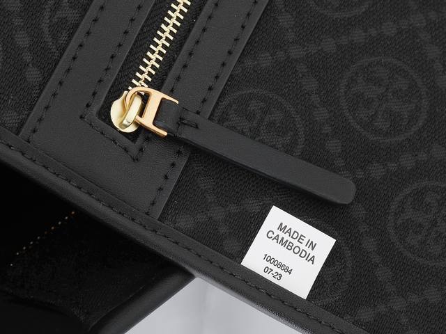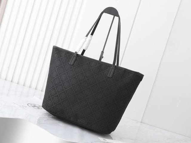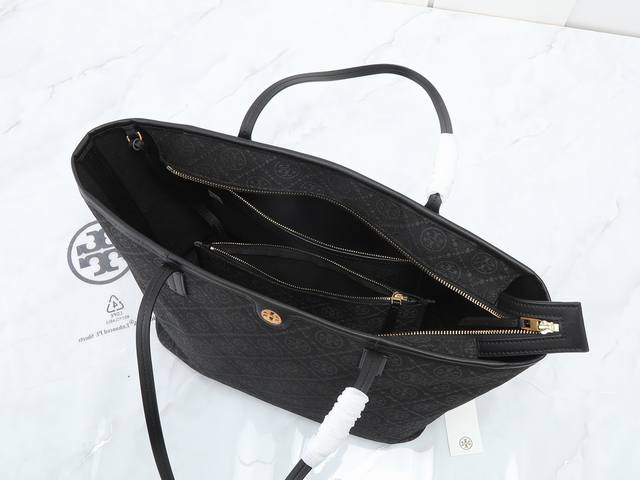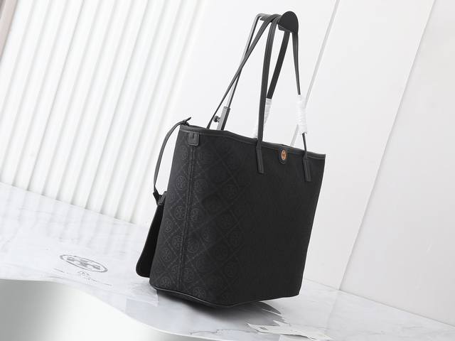Large Tory Burch Monogram Shopping Bag. The Monogram pattern, jacquard double T logo, and flowing lines create a sophisticated yet gentle look. Simple, clean, and timeless, this tote bag is crafted from select woven jacquard fabric. Small size suitable for laptops 13 inches and under; Large size suitable for laptops 15 inches and under. Large bag: Fabric: Fabric; Lining: Synthetic leather. Small bag: Fabric: Fabric; Lining: Synthetic leather. Zipper closure. Handles, vertical carrying height 23.5cm. One internal hanging zippered pocket. Detachable zippered pocket. Small size: Height 23cm; Opening length 35.5cm; Width 13cm. Large size: Height 30cm; Opening length 44cm; Width 17cm.