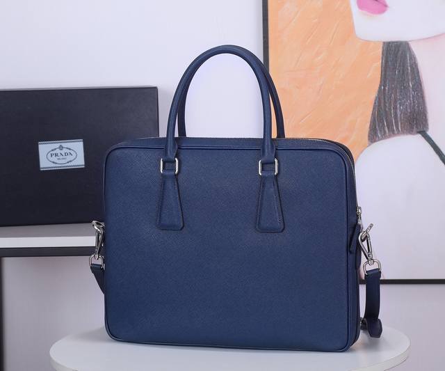 Latest hot-selling original leather Prada briefcase 0891-1, imported from Italy, featuring the classic Italian Saffiano cross-grain triangular enamel logo. Made with imported equipment and lines, all pieces have clear European original finishes. Hardware accessories are imported and environmentally friendly. The zipper closure is perfect, with details comparable to boutiques. Includes 165 manufacturing code. Dimensions: 36*28*4 cm. Stylish, casual, and a must-have for the sophisticated. Available in black and blue.