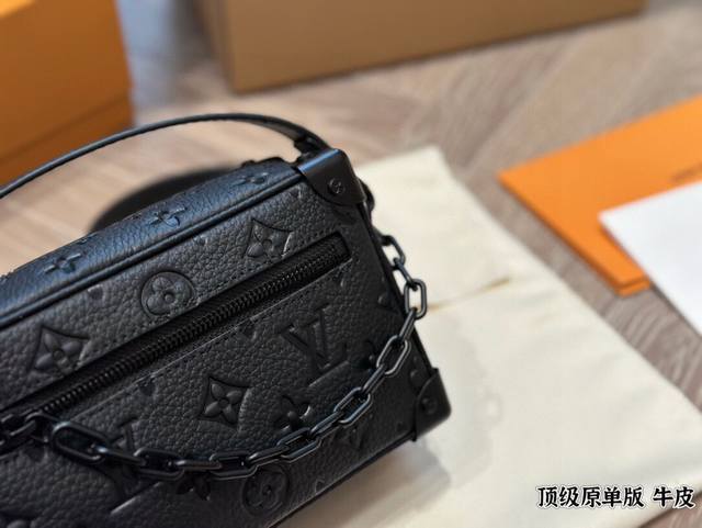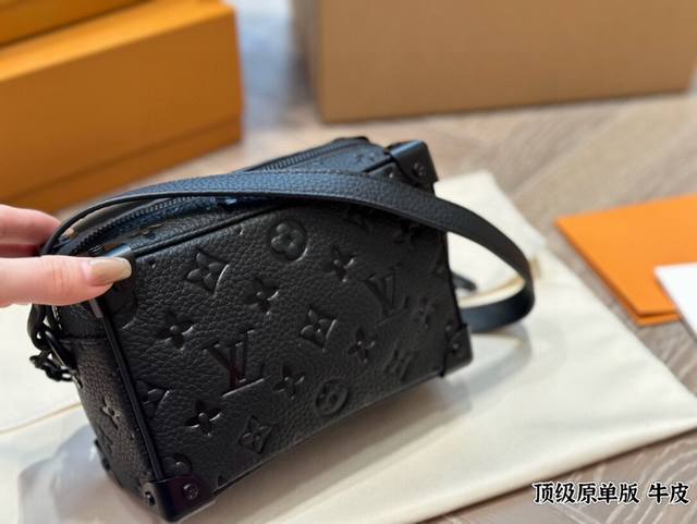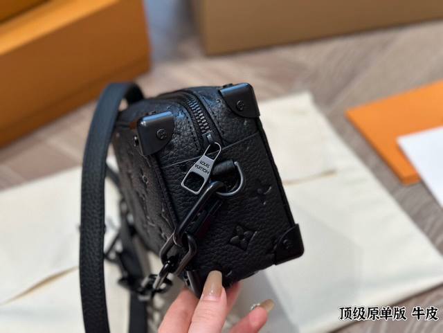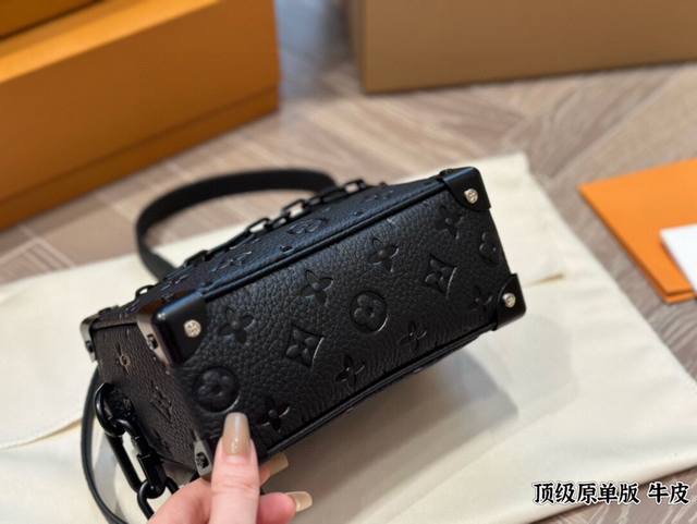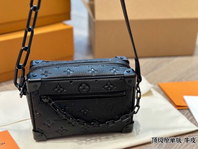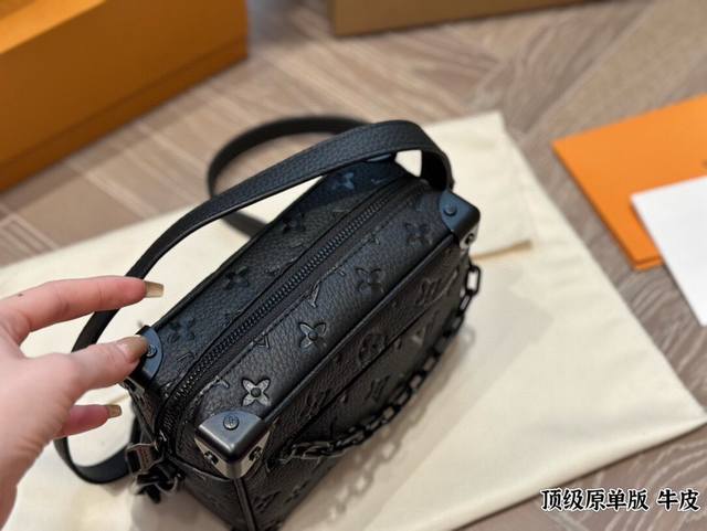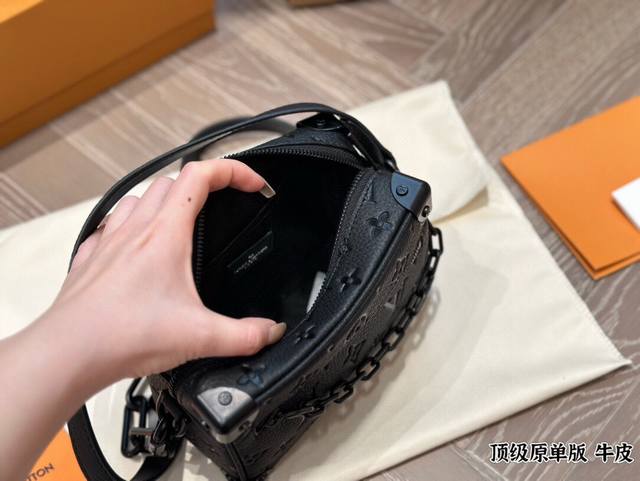 Leather Louis Vuitton Keepall Soft Trunk bag, a unisex square box bag in cowhide. The Louis Vuitton classic look was given to this Soft Trunk handbag by Louis Vuitton's Men's Artistic Director, Virgilabloh. The bag has ample space, and the zippers are very smooth, so you can easily rummage through it without hurting your hands. 18cm.