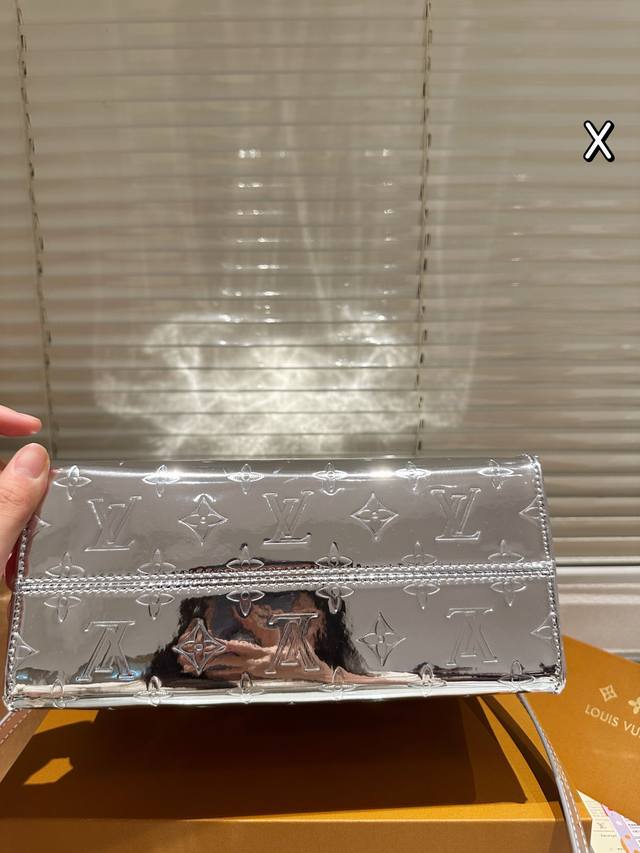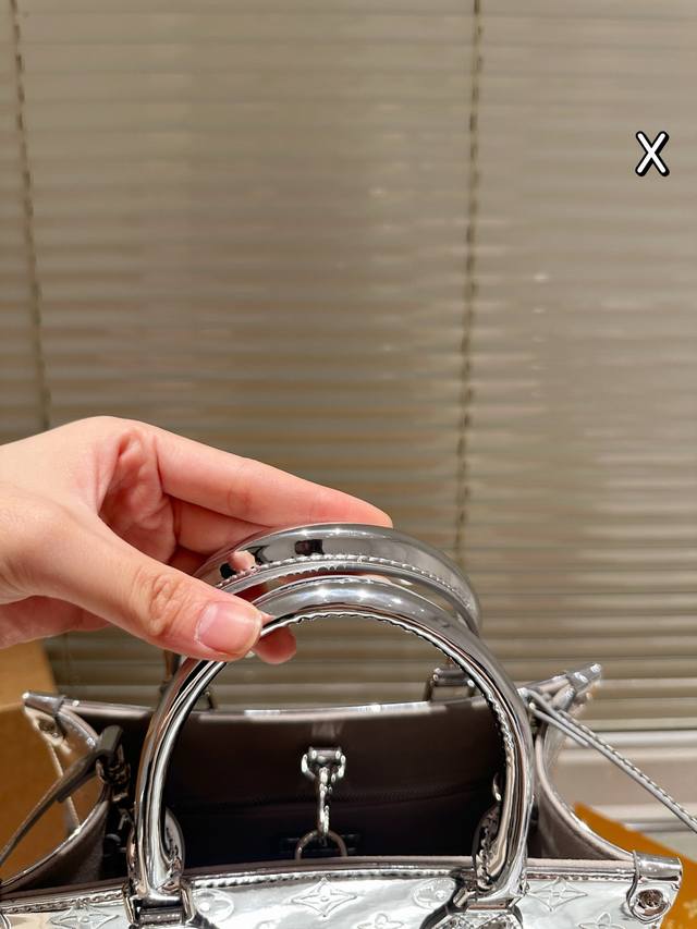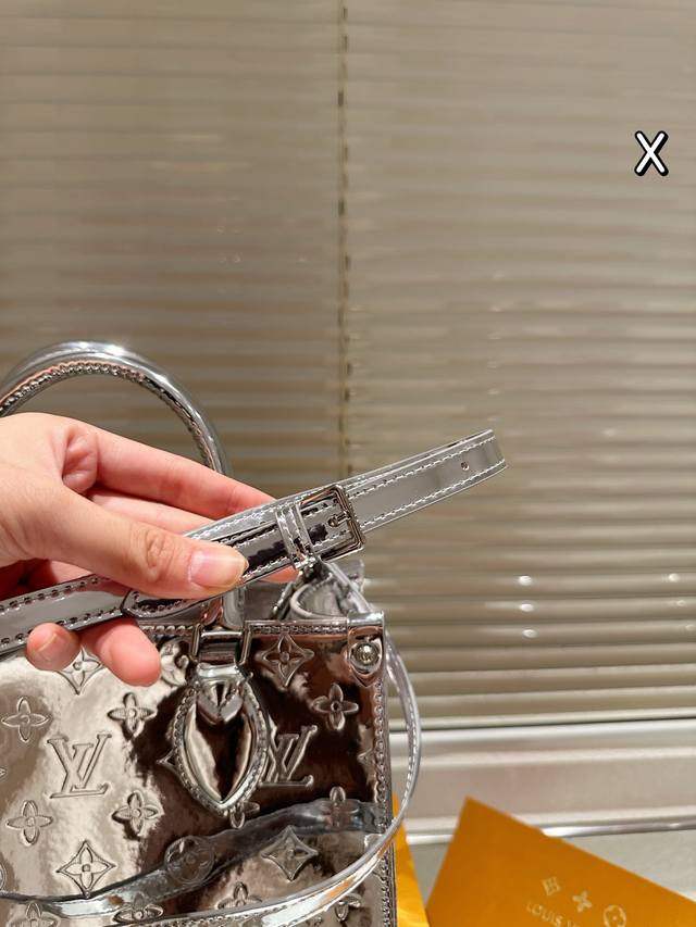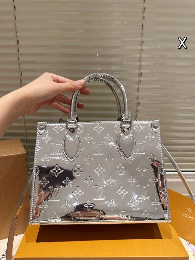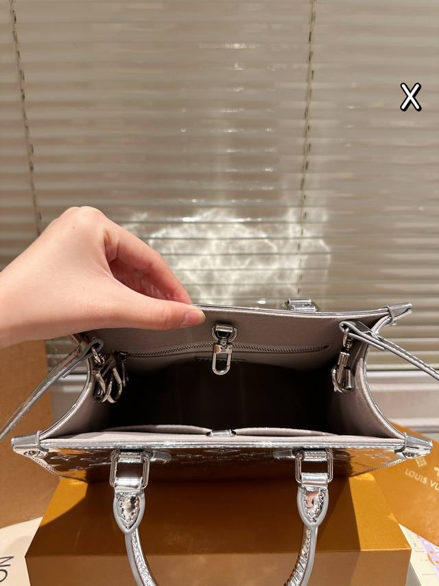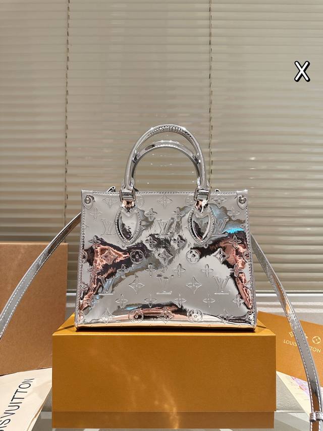 ) This Louis Vuitton Onthego silver handbag is a new addition to the 2025 Fall/Winter Louis Vuitton Ski collection. It features glossy silver leather with the classic Monogram embossing and a striking mirror-like finish! The bag has a structured look, with a metal handle and heart-shaped charm, showcasing exquisite details. The size is just right, suitable for commuting or travel. The interior space is well-designed, making it both practical and stylish. Inspired by a ski theme, it combines fashion and adventure, making it a perfect addition to any fall/winter wardrobe. (