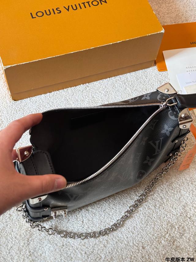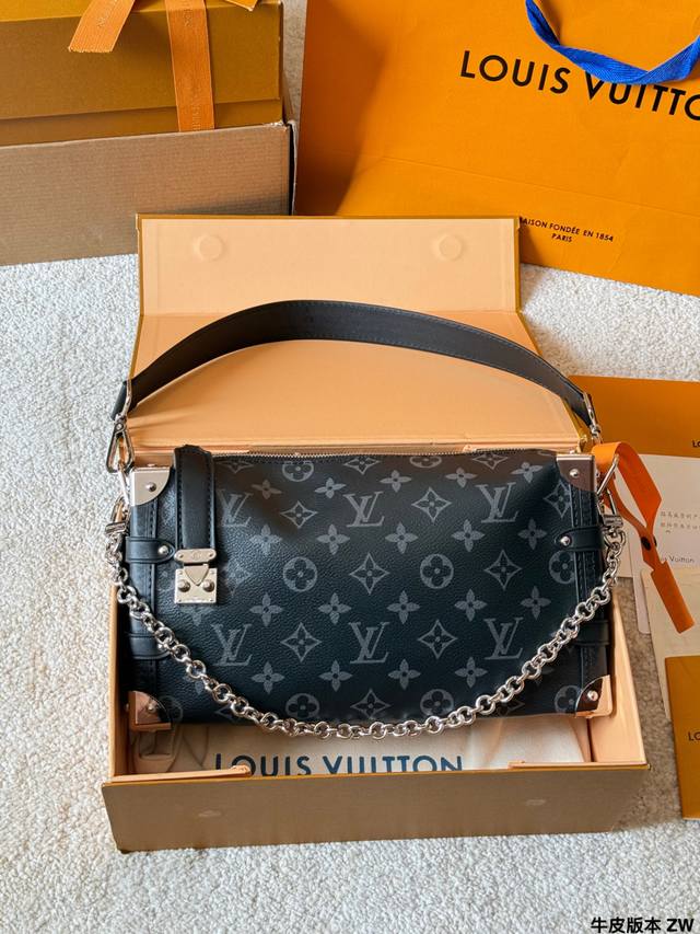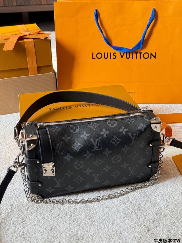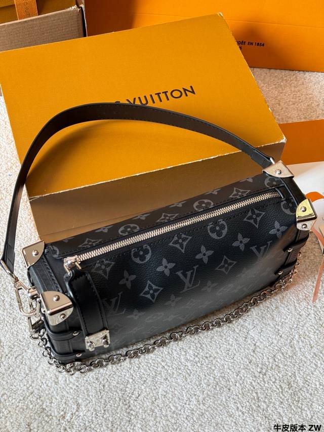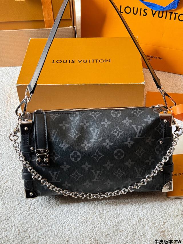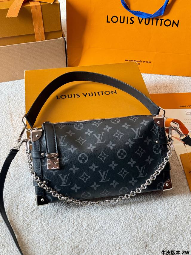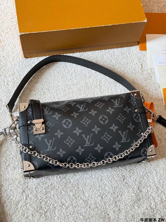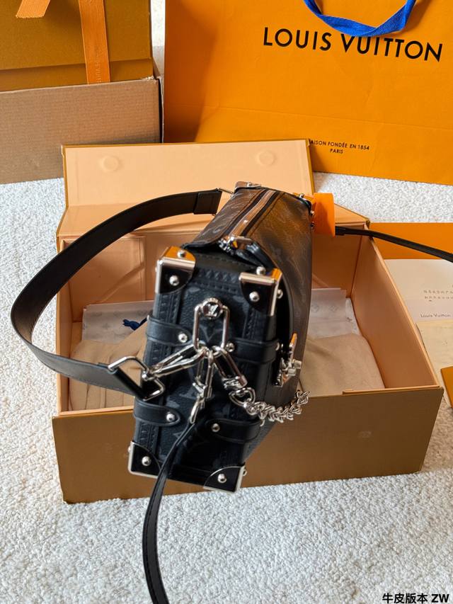 LV Side Trunk bag features the classic Monogram pattern combined with black and grey denim, silver metal corners, and a trunk-inspired design that's highly recognizable! Measuring 28