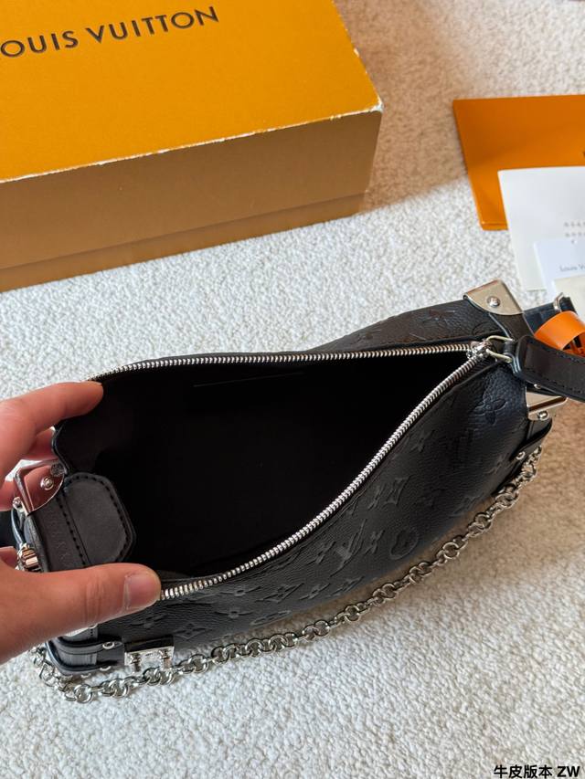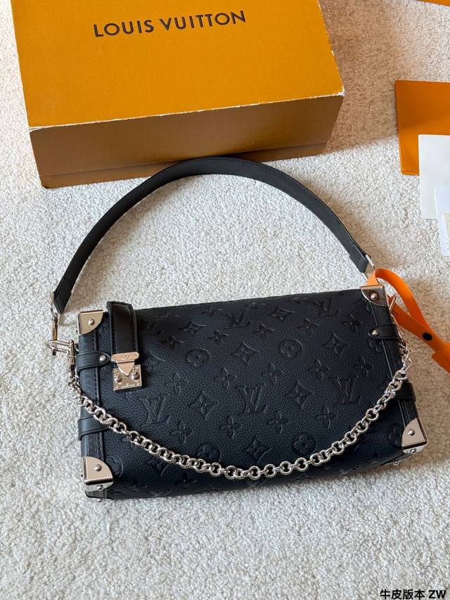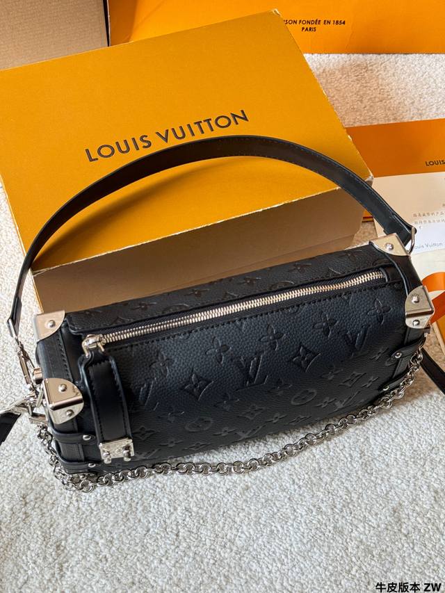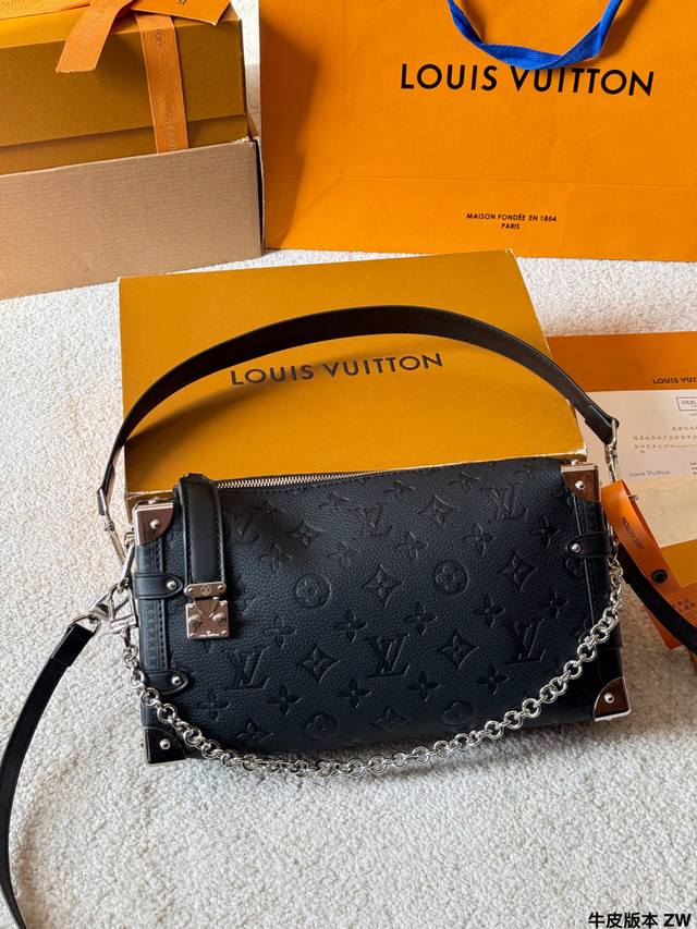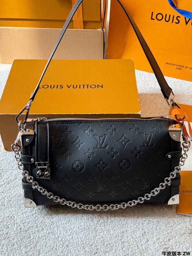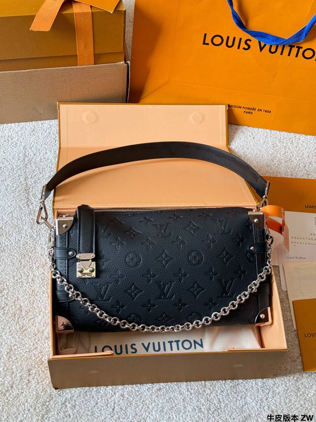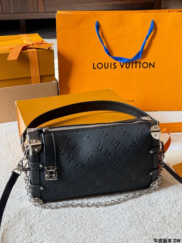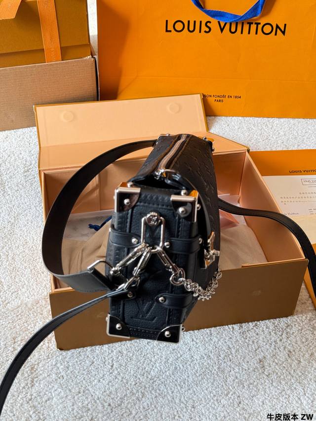 LV Side Trunk bag with black and silver embossed design. Featuring the classic Monogram pattern and black and grey denim, silver metal corners, and a trunk-inspired design for high recognizability! Measuring 28