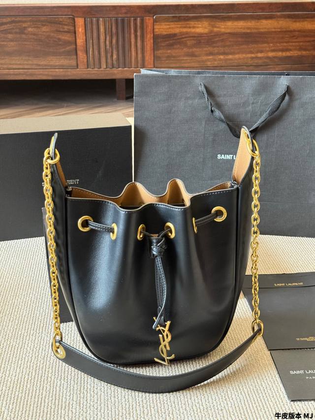 Leather Version YSL Saint Laurent Drawstring Bucket Bag. This black calfskin drawstring bucket bag from Saint Laurent features a gold chain and leather shoulder strap, offering a refined and durable texture. The drawstring closure is convenient and allows for natural wrinkling, adding a touch of style and detail. With a moderate capacity, it's suitable for both commuting and casual occasions! The chain shoulder strap allows for both shoulder and crossbody wear, making it versatile and easy to match with minimalist or retro styles. It's a practical and stylish item. Dimensions: 20-25cm.