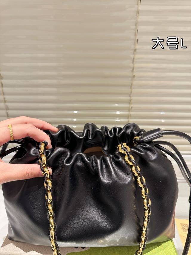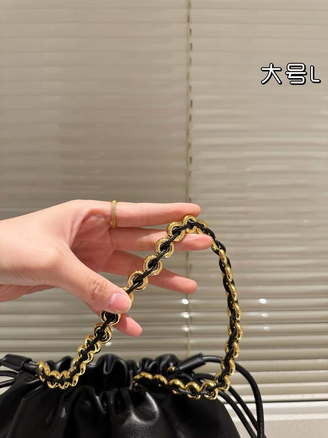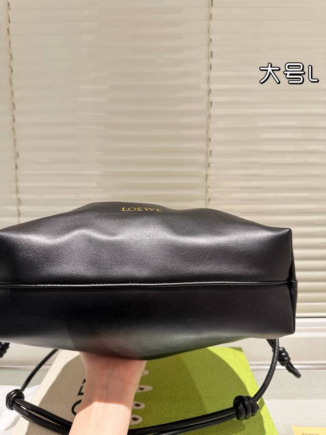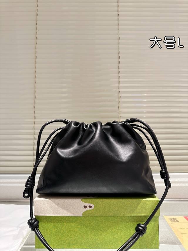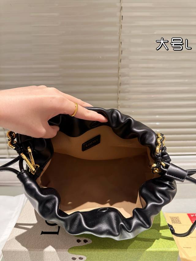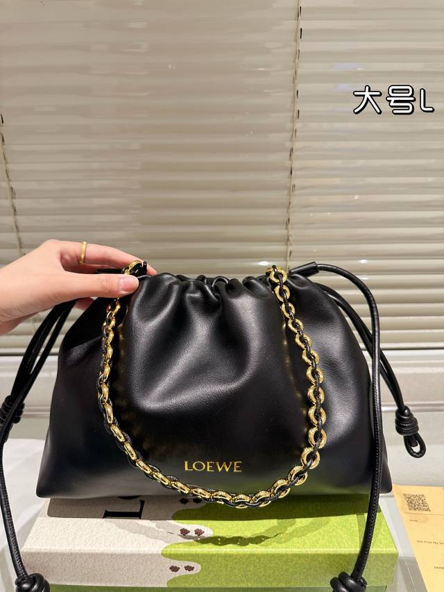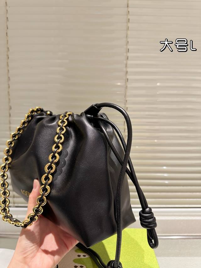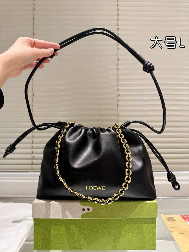 Loewe Purse Lucky Bag (Miniature) - Made of Soft Nappa Lambskin Flamenco Leather. This Loewe lucky bag features a pleated design and key details such as the signature rope knot on the side. Stylish and versatile, it can be carried as a clutch, over the shoulder with the donut chain, or crossbody with the leather shoulder strap. This version is crafted from soft Nappa lambskin leather. * Shoulder, crossbody, or hand carry * Detachable and adjustable leather shoulder strap * Detachable donut chain embellishment * Anagram engraved pebble pattern * Discreet magnetic closure * Suede lining with gold or silver foil stamping * Matching metal chain extended leather shoulder strap. Dimensions: 23 x 18 cm
