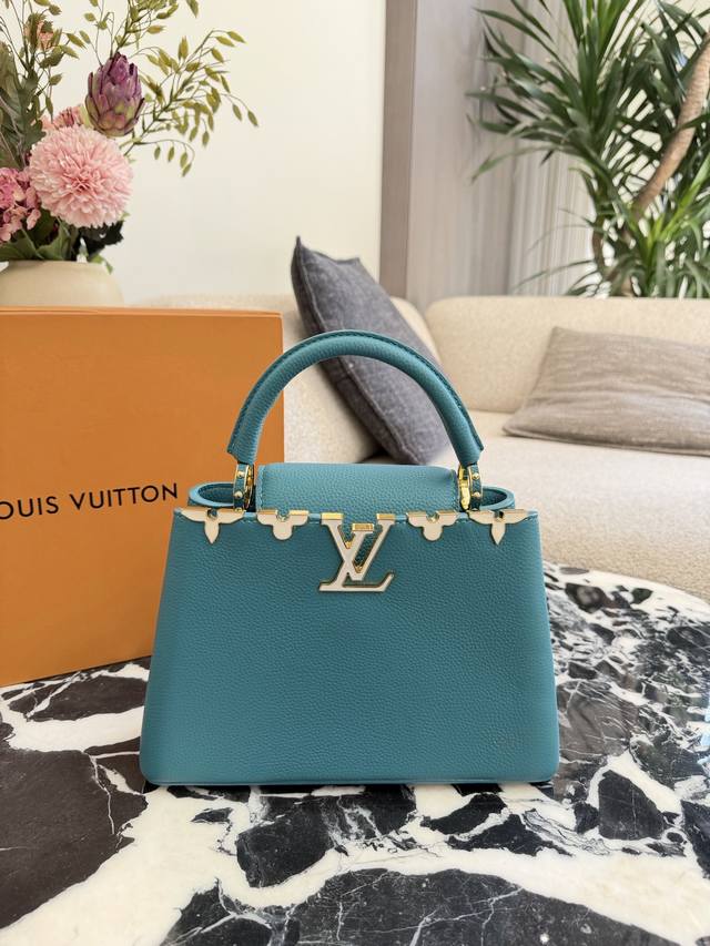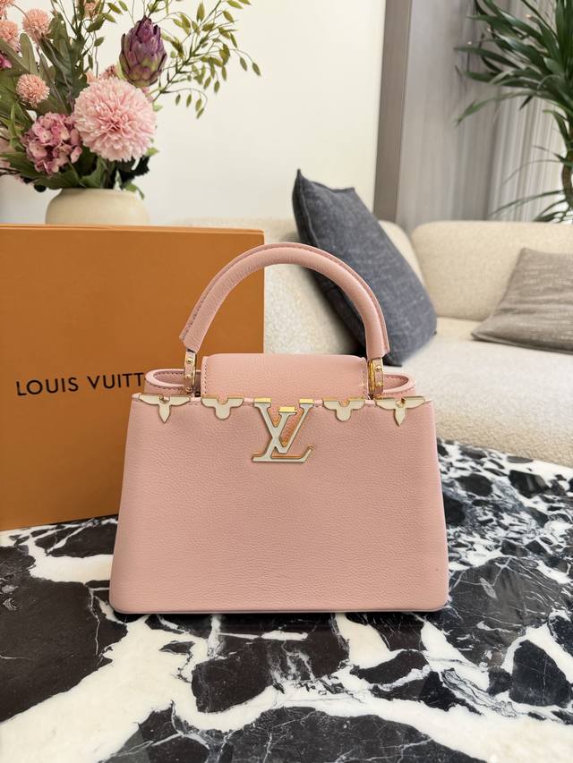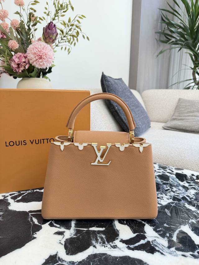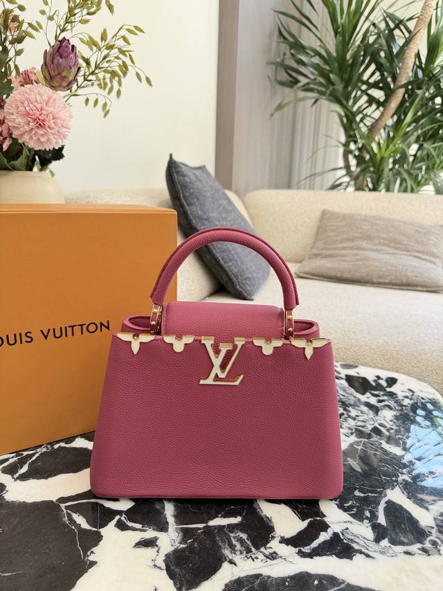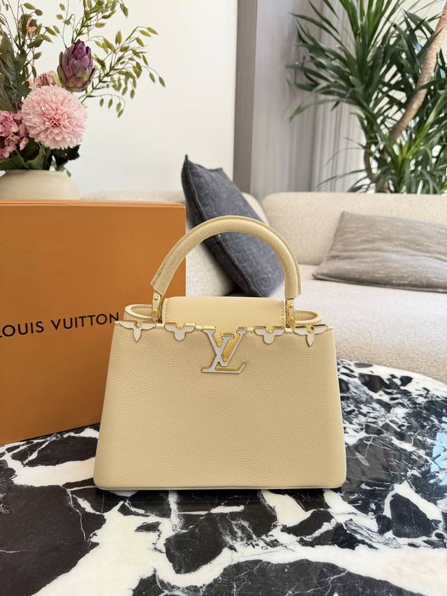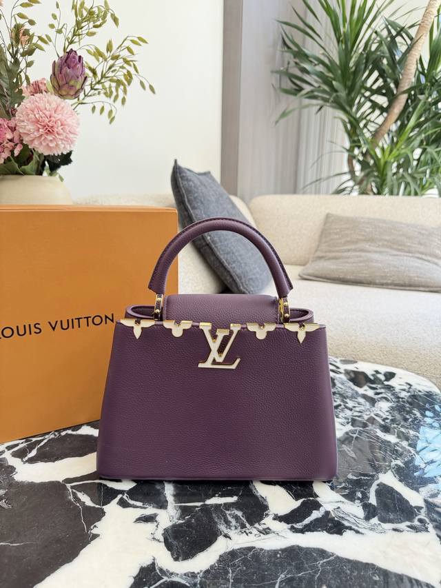 LV Capucines Handbag. This LV Capucines handbag is made of black Taurillon leather with white mother-of-pearl enamel trim. The metal LV logo is highly recognizable. It measures 27cm, making it compact and exquisite. It can be carried by hand or crossbody, and comes with a detachable shoulder strap, making it versatile and easy to style.