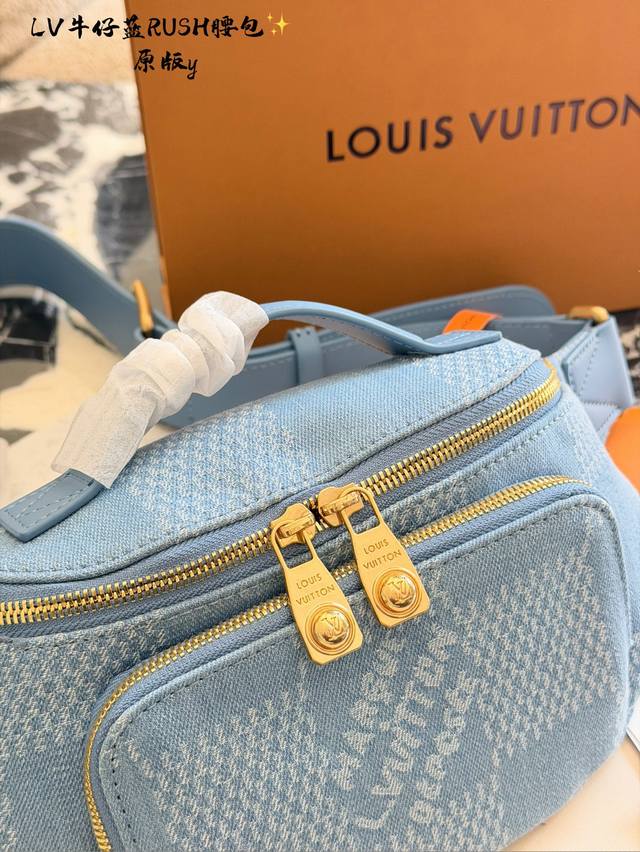 , my darlings! This denim blue LV Rush waist bag is a hardcore fashion item designed specifically for spring and summer! The classic Monogram canvas is mixed with a denim blue coating, like blending retro denim style and French monogram into one time. The metal zipper has an aged gold sheen, and the feel of opening and closing it with one hand is incredibly smooth.