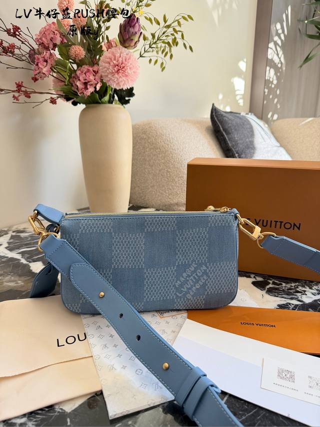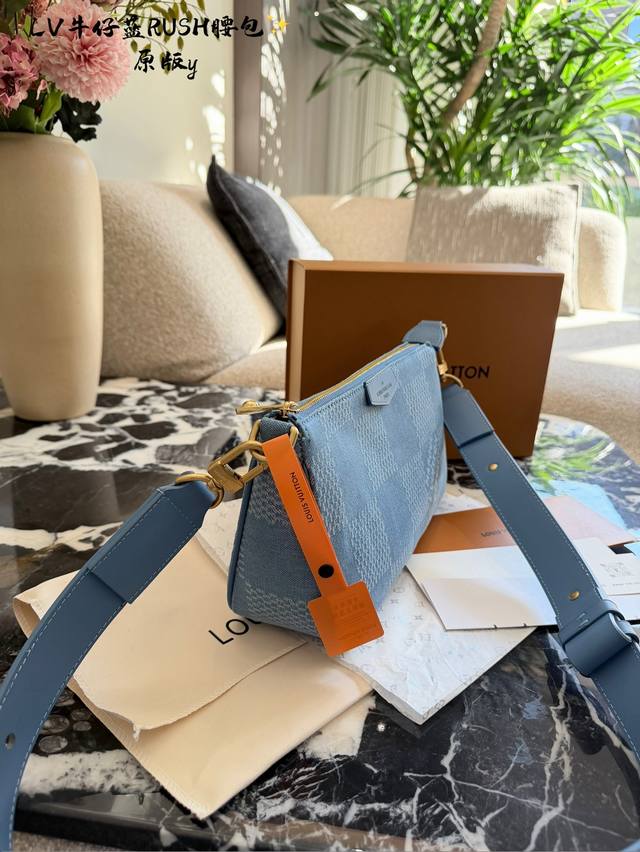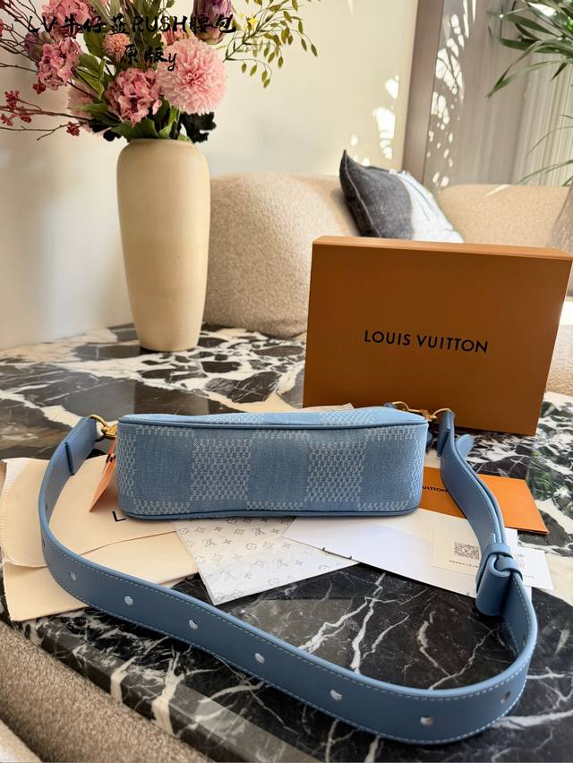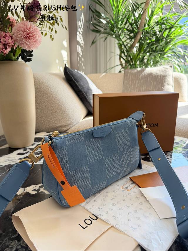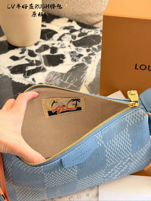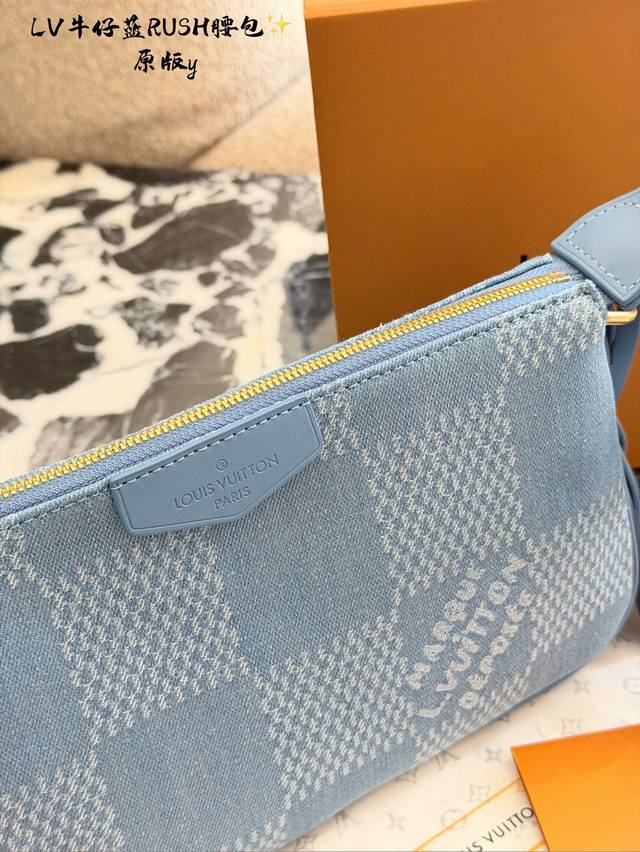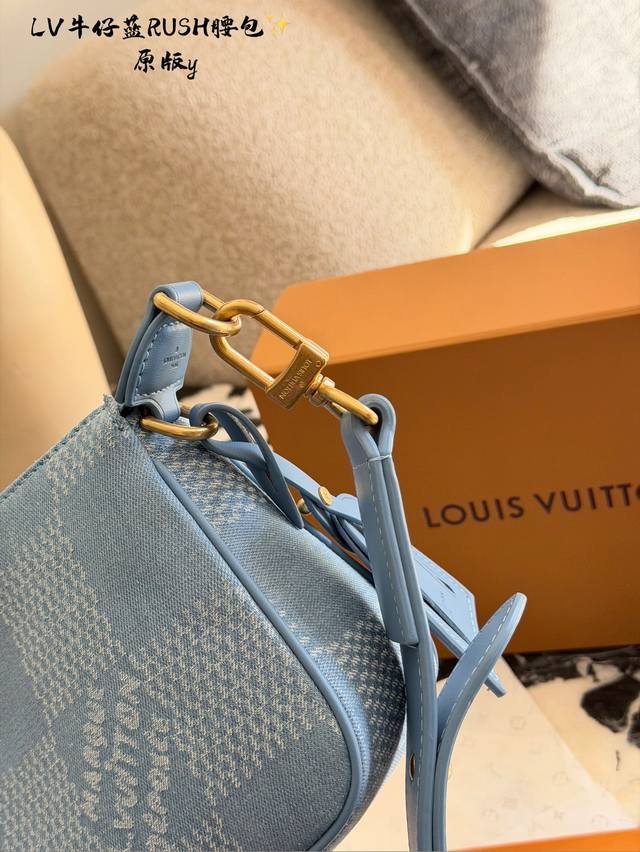 , my darlings! This denim blue LV Rush waist bag is a hardcore fashion item designed specifically for spring and summer! The classic Monogram canvas is mixed with a denim blue coating, like blending retro denim style and French monogram into one time. The metal zipper has an aged gold sheen, and the feel of opening and closing it with one hand is incredibly smooth.