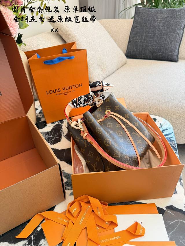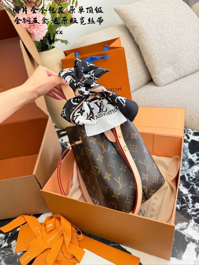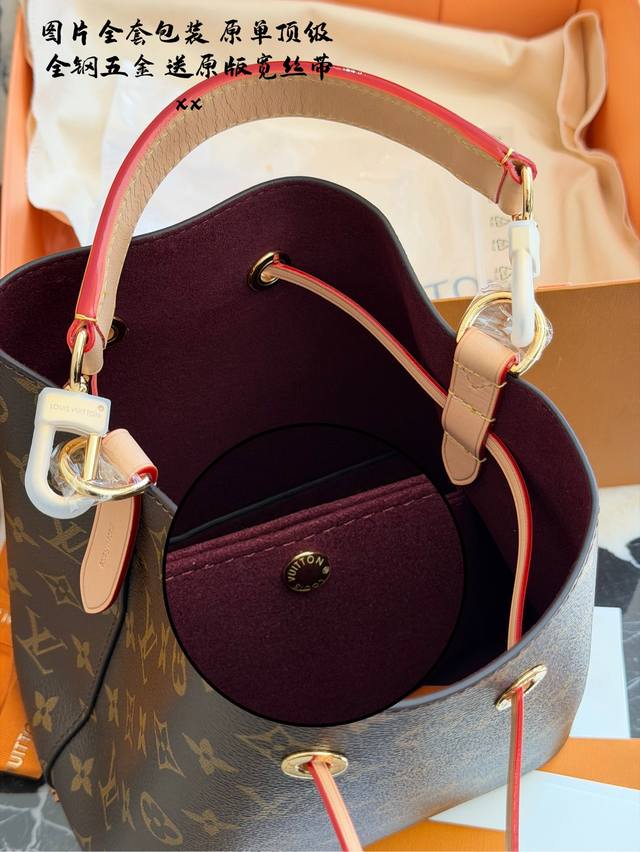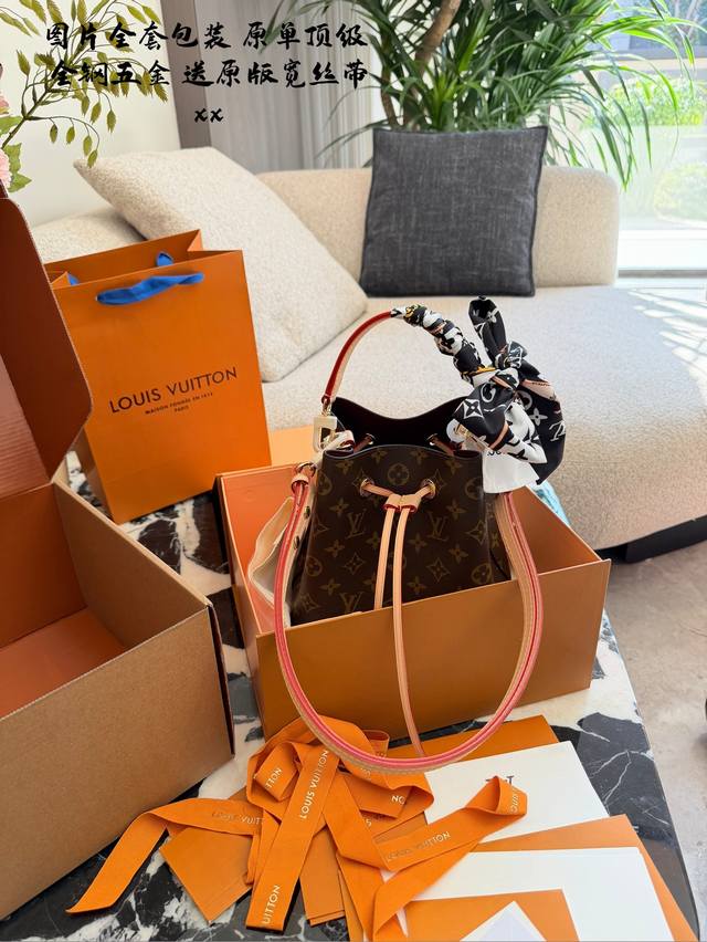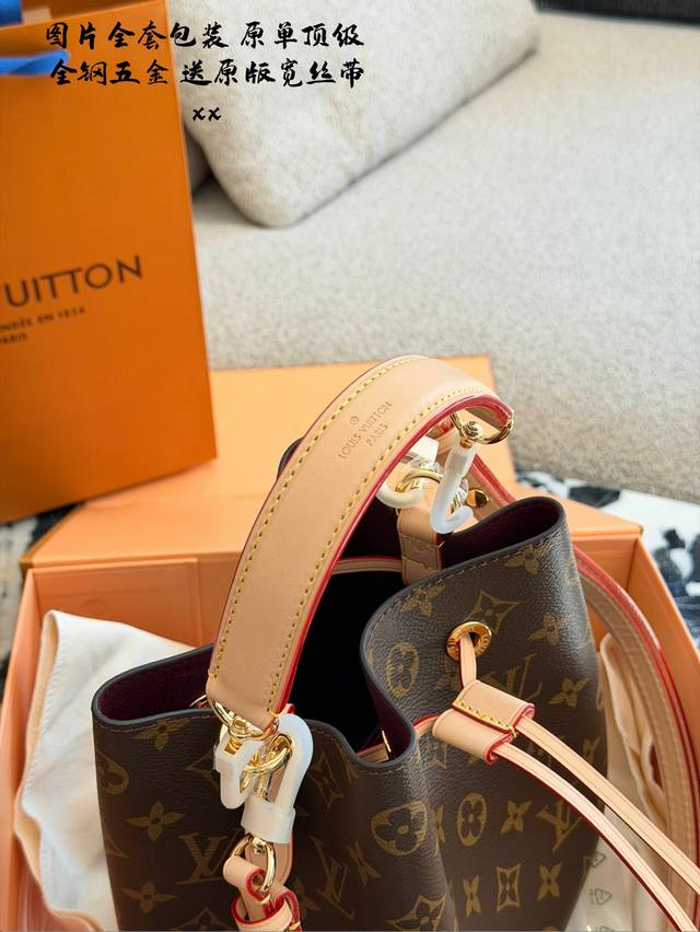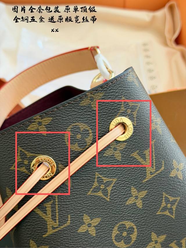 LV Neonoe BB Mini Bucket Bag. This LV Neonoe BB mini bucket bag features classic Monogram canvas with leather trim and a drawstring design for a retro feel. Measuring 21