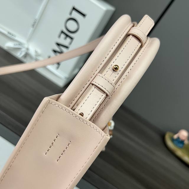 Standard A5 Tote Handbag: Simple yet striking, this bag boasts a clean silhouette, a practical shape, and a simple top handle. This A5 version is crafted from glossy calfskin leather with a Loe*We logo embossed on the front. Features include: Hand carry, shoulder carry, or crossbody wear; detachable and adjustable shoulder strap; interior slip pocket; customization options include the shoulder strap and personalized charms; herringbone cotton lining. Size: 21*17*6cm. Model: 652307 Limited Edition.