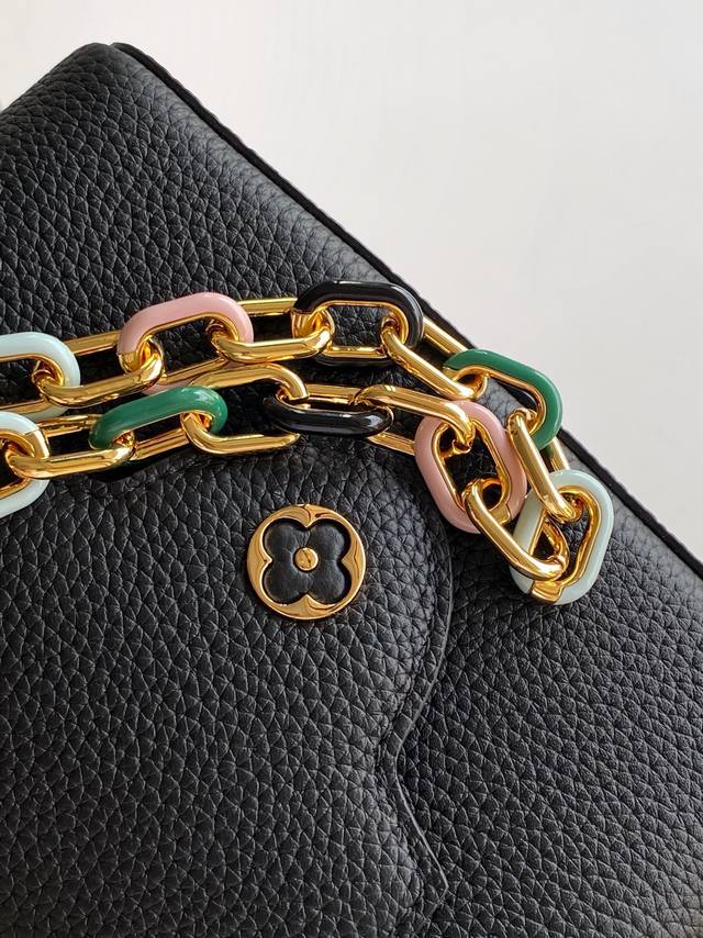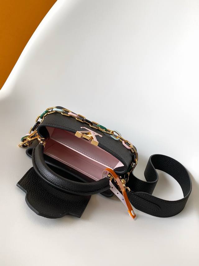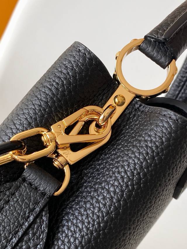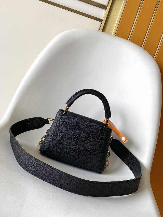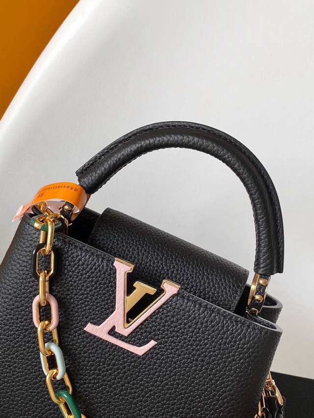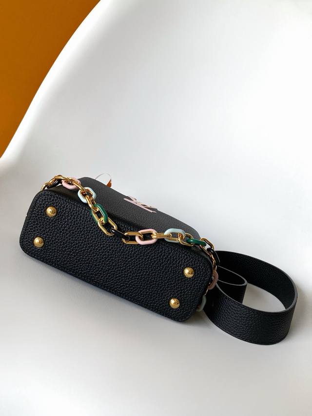 M21798 Chick Yellow M21641 Black Premium Original Leather Dynamic Code Chip This Capucines BB handbag is crafted from grained Taurillon cowhide leather, featuring elegant enamel inlays on the delicate chain's octagonal links, exuding a jewel-like luxury. Its compact design can accommodate a smartphone, a long wallet, and other small items. 27.0 X 18.0 X 9.0 cm (Length X Height X Width) 21.0 X 14.0 X 8.0 cm (Length X Height X Width)