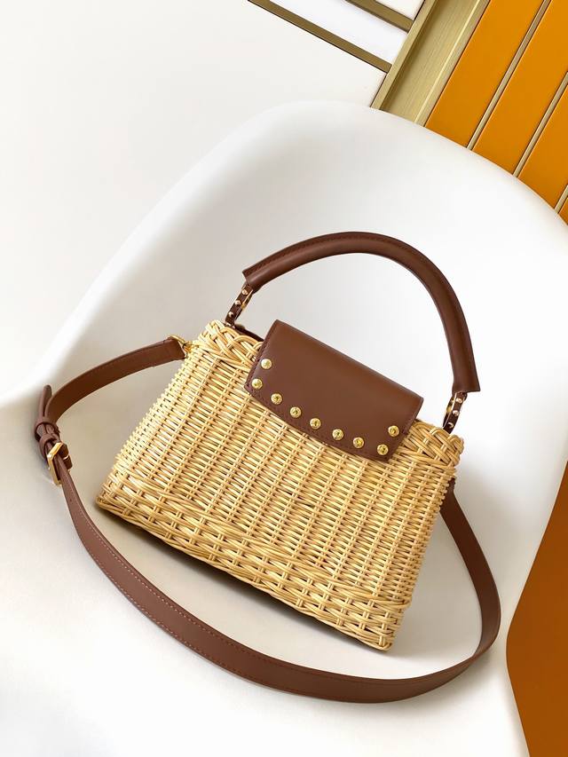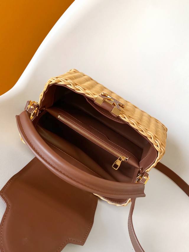 M24976 Orange M11617 Brown Premium Original Dynamic Code Change This Capucines BB handbag features a chic rattan woven design, paying homage to the Louis Vuitton picnic trunk design launched in 1892. The top handle and flap are crafted from cowhide leather, with the LV lettering adding a metallic touch. A detachable and adjustable leather shoulder strap allows for convenient shoulder carrying. The gift box packaging included with this product may vary depending on stock availability and may differ from the packaging shown on this product page. Please refer to the actual gift box packaging received. 27.0 X 17.3 X 9.0 cm (Length X Height X Width)