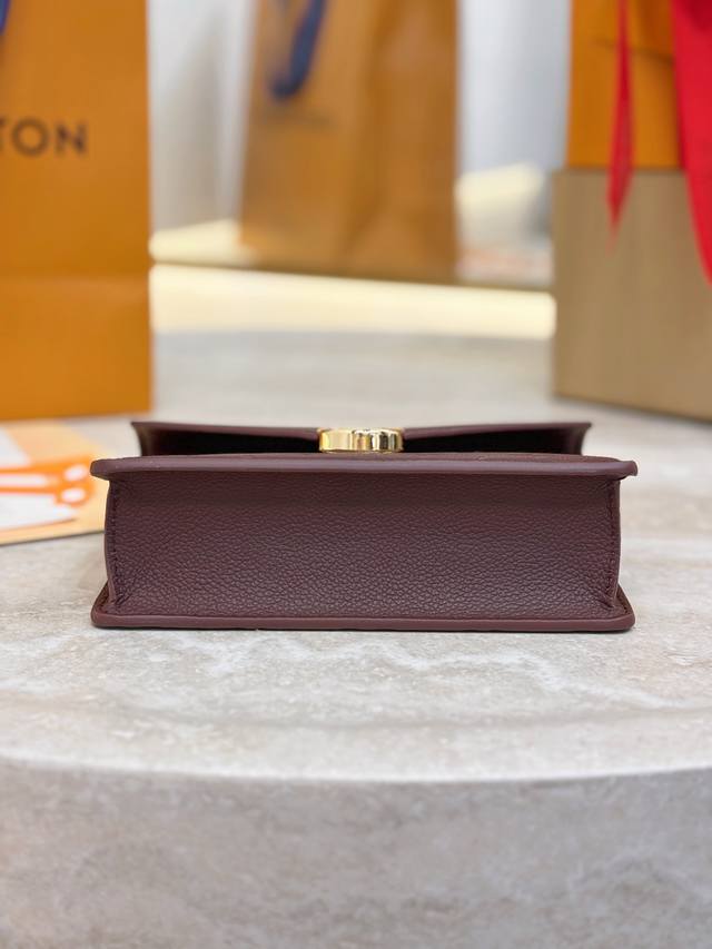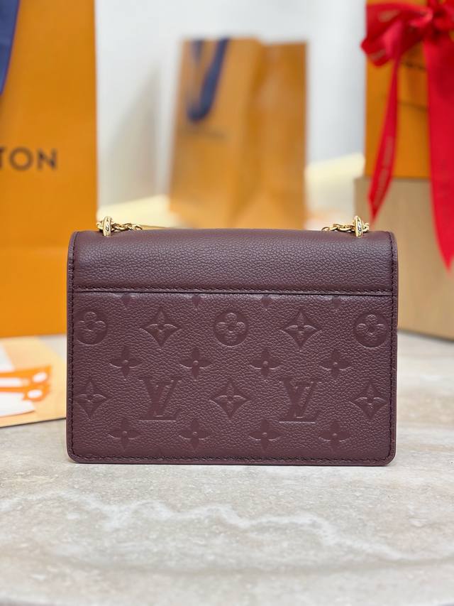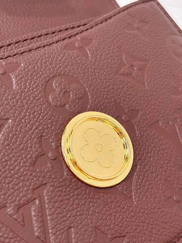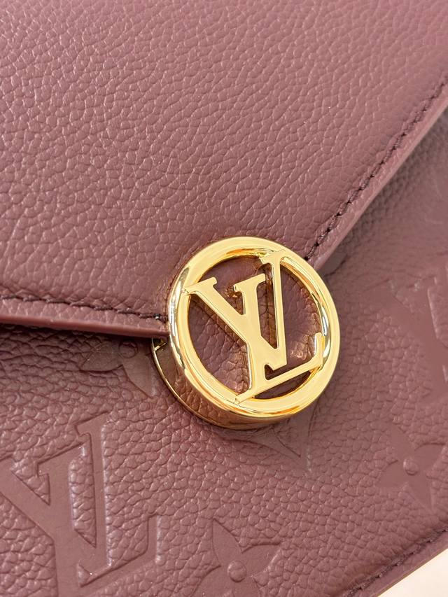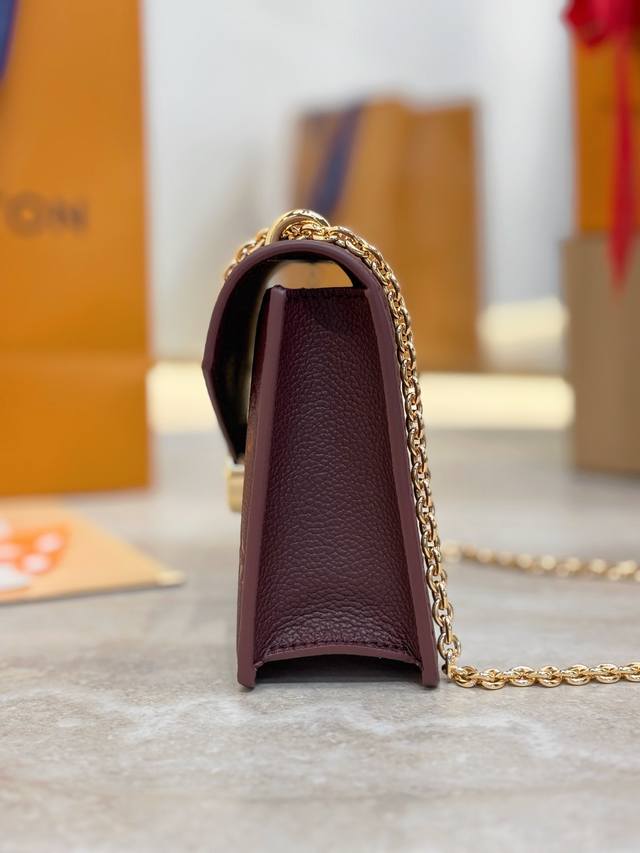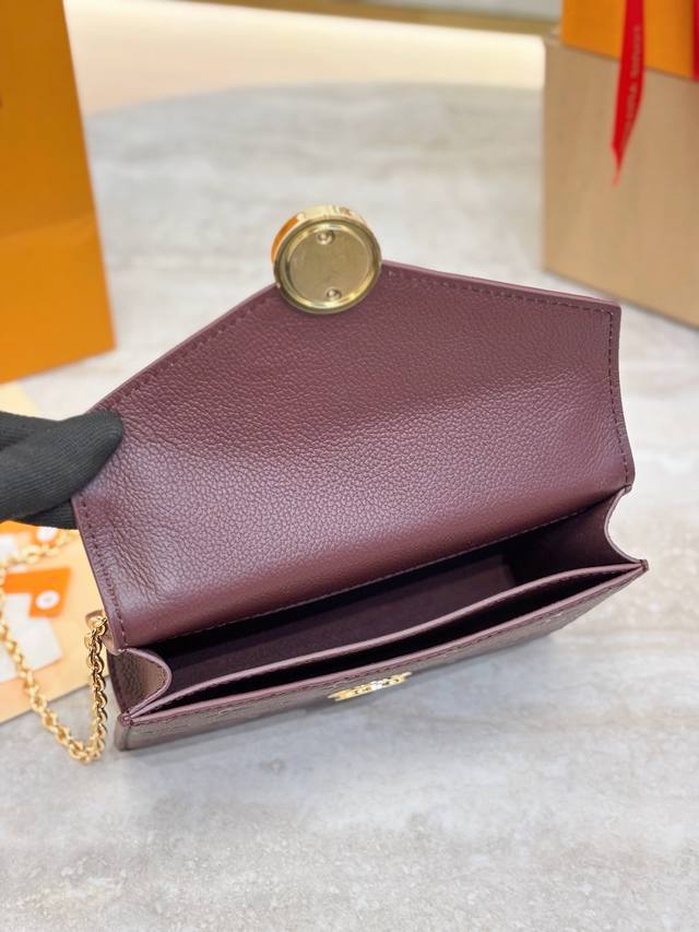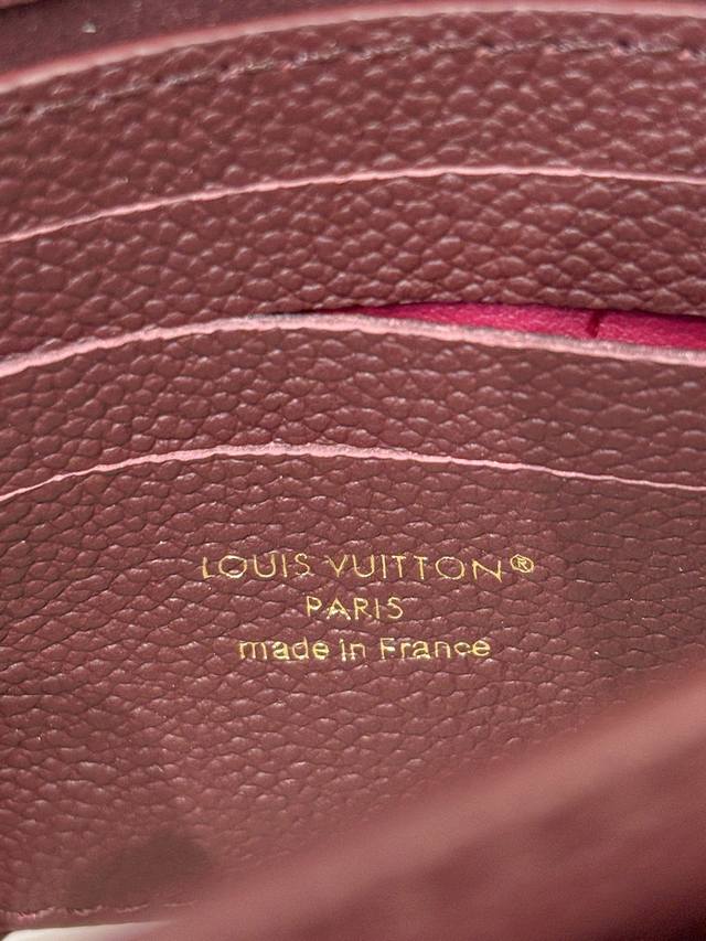 This elegant chain charm wallet, "Rosy," boasts a timeless classic burgundy hue that complements any style. Crafted from the brand's signature Monogram Empreinte leather, it's adorned with a gold-toned Lv Circle pattern and a smooth chain for easy shoulder carrying. This stylish design is a comfortable size to hold everyday essentials and features three card slots for secure credit cards.