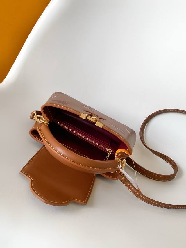 The LV Travels With series brings a classic color palette to the Capucines BB handbag, adding lively details with hand-drawn cat illustrations by fashion icon and artist Grace Coddington. This reissue originates from the first collaboration in 2010, featuring a cowhide leather body adorned with the LV logo. The flap can be worn inside or outside, and the detachable long shoulder strap allows for multiple carrying options. 27 x 17.3 x 9 cm (Length x Height x Width)