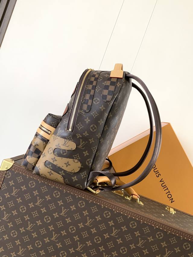 M26130 Top-tier original single-piece with variable code chip 163C. This Discovery small backpack features Monogram canvas with Monogram Reverse and Damier canvas patches, showcasing a clever fusion of the brand's classic patterns. A zippered front pocket provides easy access to frequently used items, while a sturdy handle and comfortable shoulder strap offer multiple carrying options. Dimensions: 38 x 20 x 29 cm (H x W x Length). Features include: Monogram Landscape coated canvas, cowhide leather trim, cotton lining, metal hardware, double zipper closure, adjustable shoulder strap, open side pockets, zippered front pocket, interior patch pocket, and a single handle.