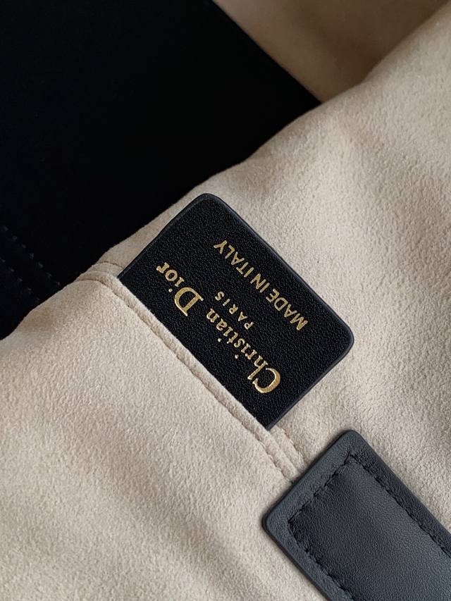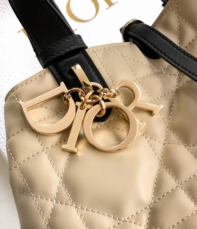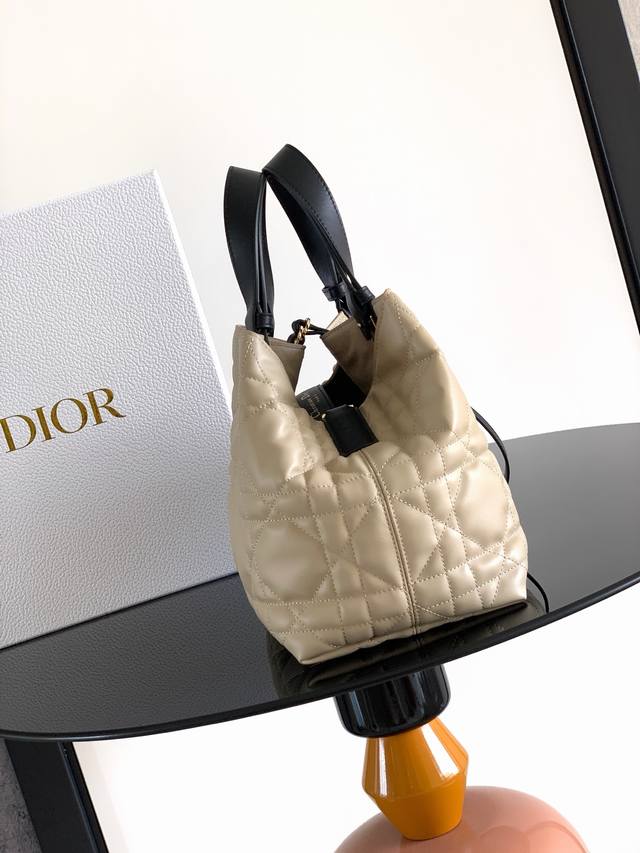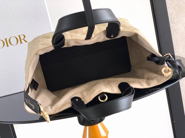 made a stunning debut at the Dior Spring/Summer 2023 ready-to-wear collection, boasting a unique blend of casual and practical design. Crafted from black calfskin leather with oversized cannage stitching, its spacious interior features compartments and small pockets for neatly organizing everyday essentials. It features a slim leather drawstring closure for secure storage, and an adjustable Cd Lock dial for added style. The medium size includes an adjustable leather handle for hand-carrying or shoulder-carrying. Double closure design: slim drawstring and Christian Dior Paris drawstring with Cd Lock buckle. Features a DIOR charm, a detachable internal pocket, adjustable leather handles, and a dust bag. Made in Italy. Model: 2821. Dimensions: 28.5 x 21.5 x 17 cm (L x H x W. Holds 2 wallets, 1 mobile phone, 2 cardholders, sunglasses, and lipstick.