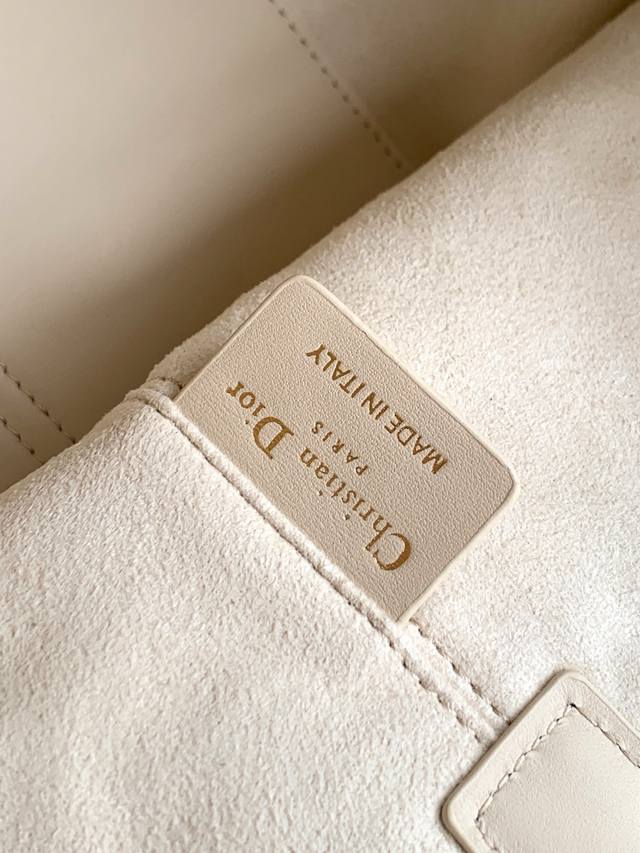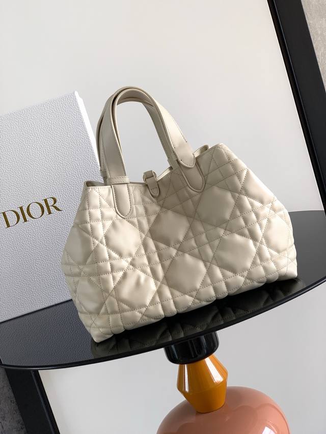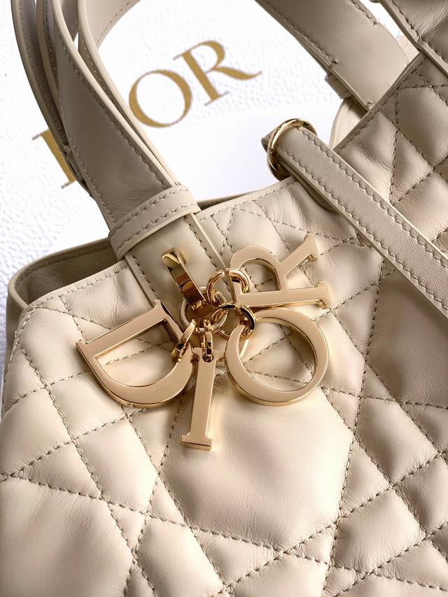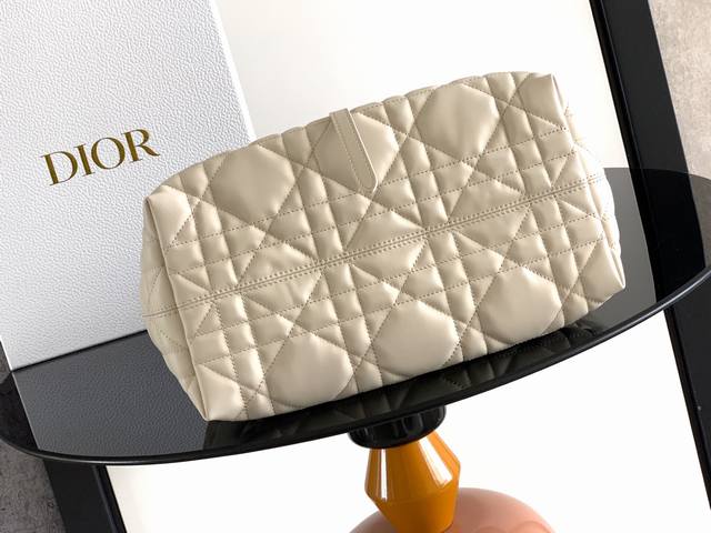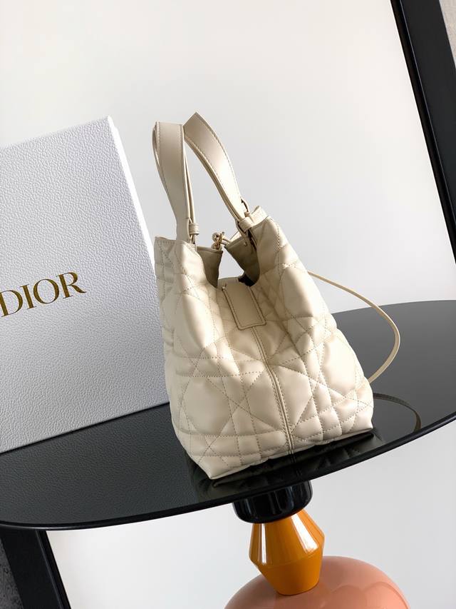 made a stunning debut at the Dior Spring/Summer 2023 ready-to-wear collection, showcasing a unique blend of casual and practical design. Crafted from black calfskin leather with oversized cannage stitching, its spacious interior features compartments and small pockets for neatly organizing everyday essentials. It boasts a slim leather drawstring closure for secure storage and a Cd Lock dial with adjustable sides for added style. The medium size includes an adjustable leather handle for hand-carrying or shoulder-carrying. Double closure design: slim drawstring and Christian Dior Paris drawstring with Cd Lock buckle. Features a DIOR charm, a detachable internal pocket, adjustable leather handles, and a dust bag. Made in Italy. Model: 2821. Dimensions: 28.5 x 21.5 x 17 cm (L x H x W. Holds 2 wallets, 1 mobile phone, 2 cardholders, sunglasses, and lipstick.